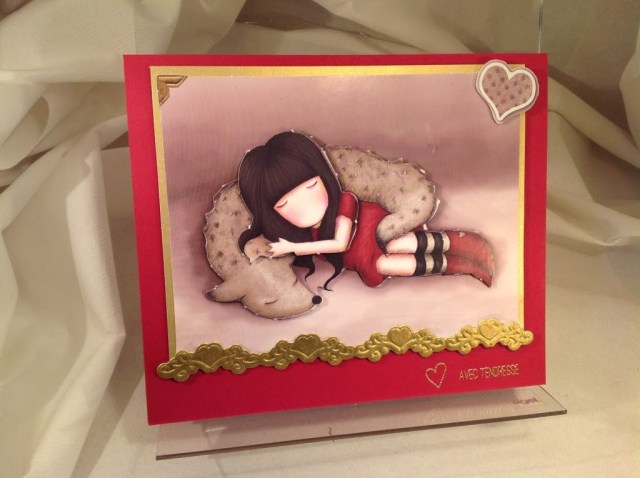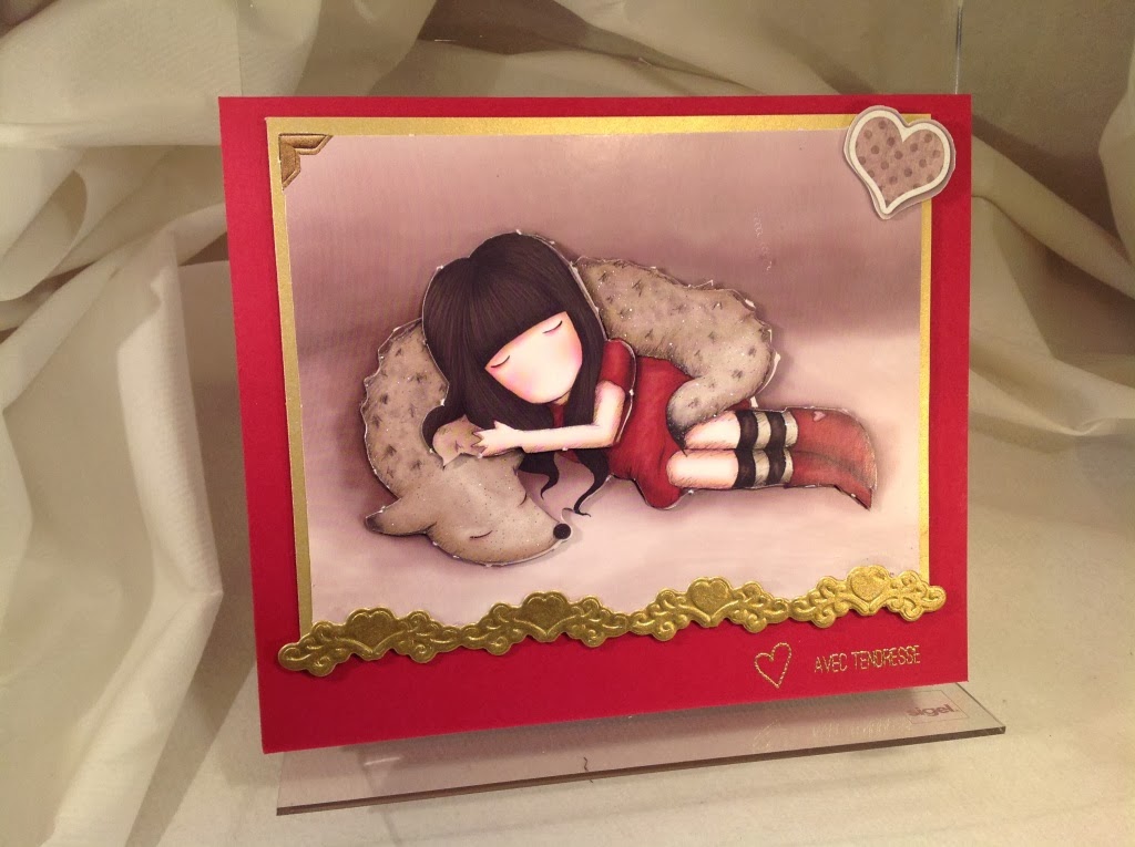 Cela faisait un certain temps que je n’avais pas utilisé les adorables personnages de Suzanne Woolcott, alors j’ai choisi cette jolie petite Gor Juss pour la carte d’anniversaire de ma fille Marie, un peu dans les couleurs traditionnelles de Noël, c’est normal puisqu’elle est du 16 Décembre !