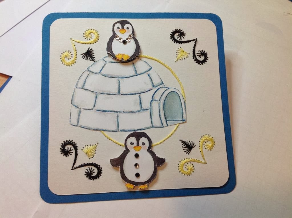 Bonsoir !  Jolie surprise aujourd’hui, cette  carte brodée ornée de petits pingouins en 3D que j’ai reçue de Clémence, qui du haut de ses 6 ans admire les réalisations de Virginie sa maman, apprend et participe dès qu’elle le peut ! Cette carte m’a fait grand plaisir Clémence, un grand merci à toi et à ta maman !