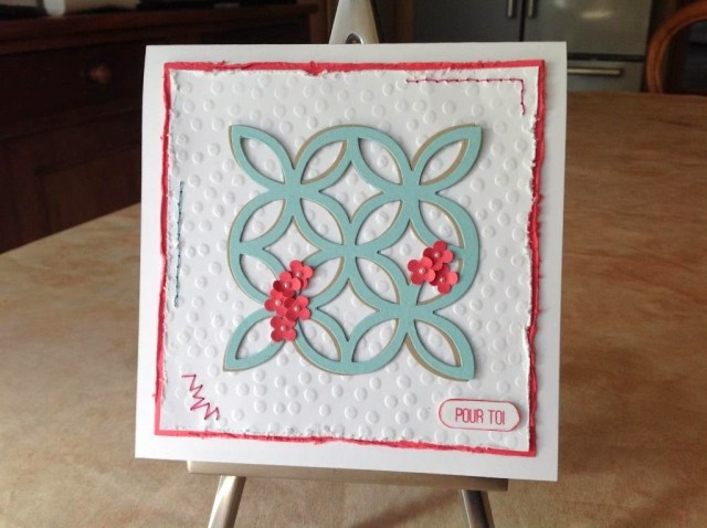 Le mat blanc est un carré de 13,5 x 13,5, les bords usés comme précédemment puis passé à la Big Shot avec le plioir Pois Décoratifs. J’ai assemblé les deux épaisseurs de papier en faisant quelques points de couture à la main avec des fils de couleurs assorties aux papiers.