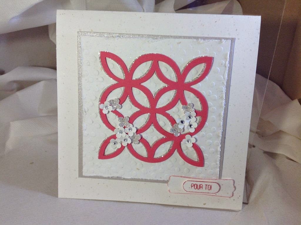 Encore un anniversaire, celui de mon amie Françoise ! J’étais tellement contente de celle que j’avais faite il y a quelque temps pour Agnès que j’ai réutilisé le sketch et les ingrédients de base, mais cette fois j’ai choisi les couleurs suivantes : Murmure Blanc, Bavarois de Framboise et le très beau papier à paillettes Argent.