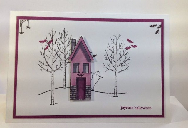 Je n’avais jamais fait de carte pour Halloween mais j’avoue que j’ai été séduite par le set de tampons en résine Comme chez nous qui offre plein de possibilités… J’ai colorisé la maison avec l’assortiment Fruit des Bois de nos nouveaux marqueurs Mariabilités , puis je l’ai découpée à l’aide des dies coordonnés. J’ai utilisé également les arbres du set de tampons Noël Blanc en arrière-plan.