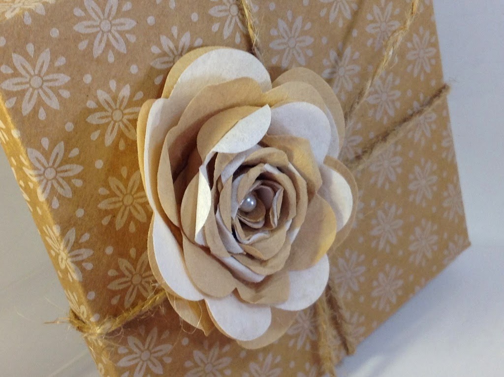 Pour celle-ci, j’ai utilisé le magnifique papier Sous le Sapin du catalogue hiver. J’ai réalisé la fleur avec le bigZ Fleur en Spirale (page 233 du catalogue général) et les papiers filtre (page 193 du catalogue général).