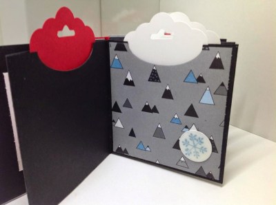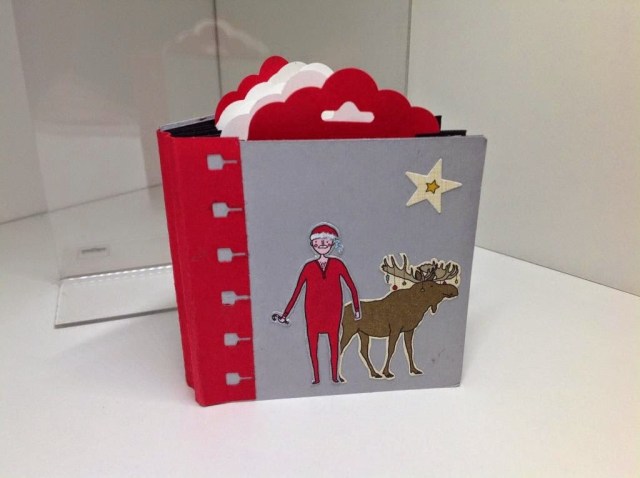 J’ai choisi un cardstock Noir Nu, pour le support, et j’ai décidé de jouer avec les papiers de la série Design Père Noël & Cie pour la déco… Ces pères Noël et ces rennes franchement atypiques et très rigolos sont donc venus égayer les pages de ce « mini-rikiki ».