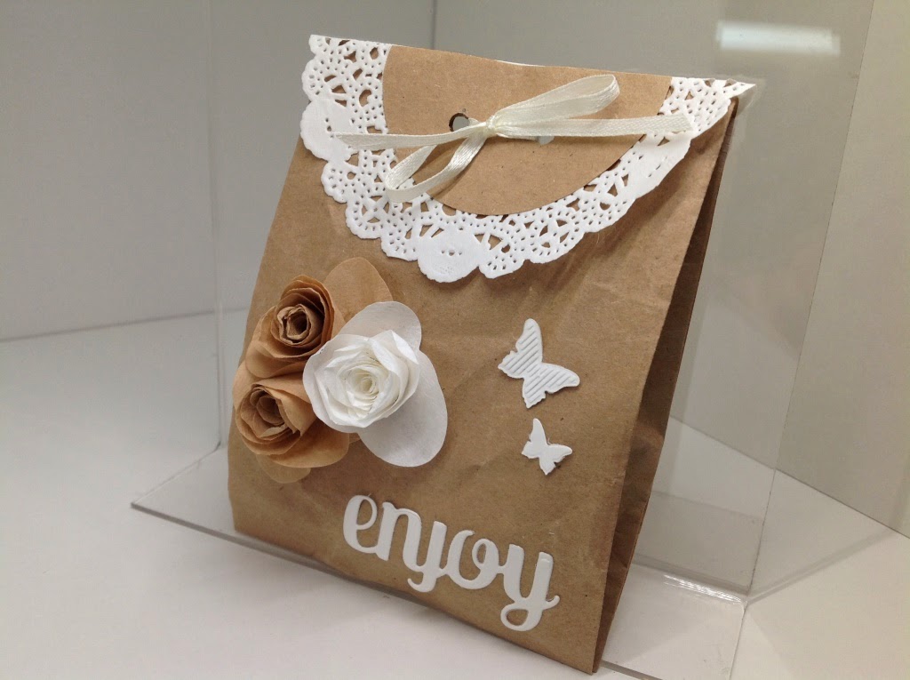 Pour la déco, des fleurs réalises avec le BigZ Fleur en Spirale, dans des filtres à café. Puis dans du papier Murmure Blanc, deux papillons découpés et embossés avec l’embosslit Ailes Magnifiques, et le mot « enjoy » est extrait du set de thinlits Mini sac de Sucrerie.