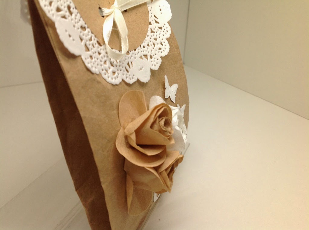 Pour fermer le sachet j’ai utilisé un de nos napperons, au centre j’ai collé un cercle de la même couleur que le sachet, je l’ai plié en deux et j’ai collé la partie arrière, ensuite deux trous à la perfo pour passer le ruban et le tour est joué.