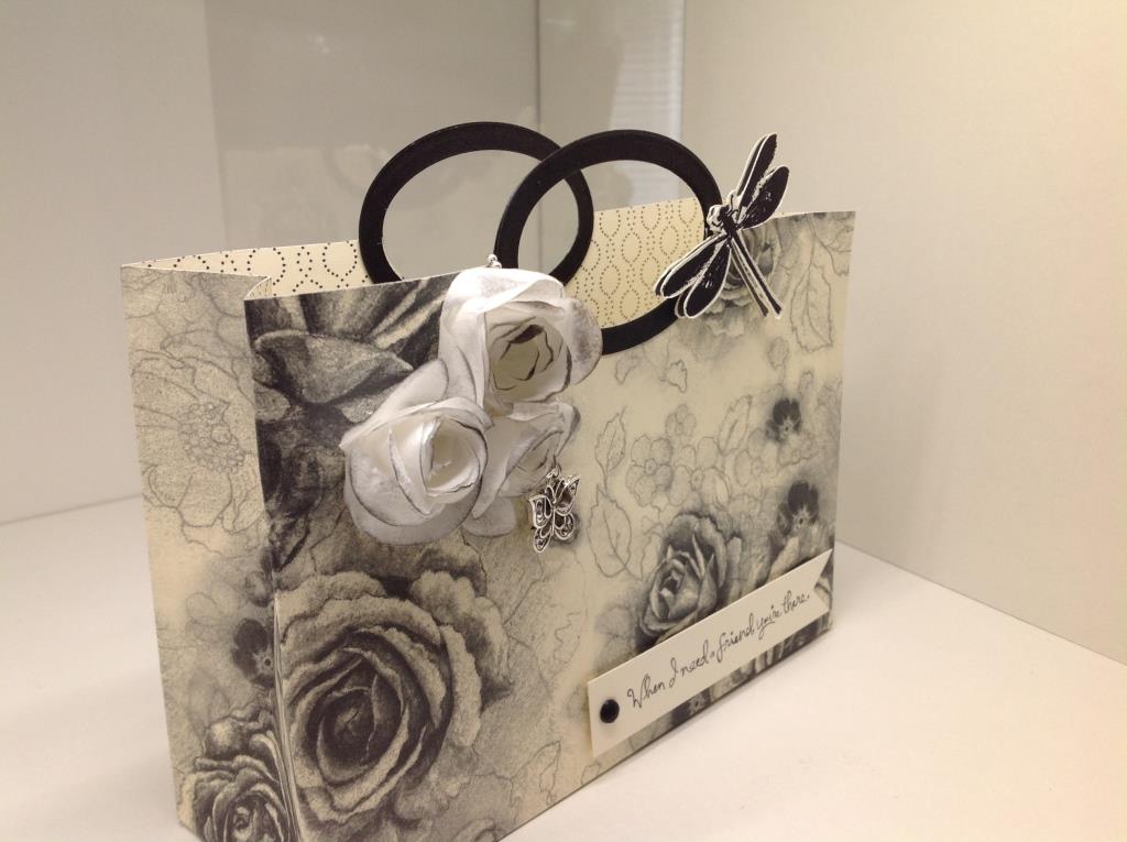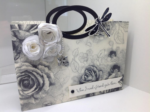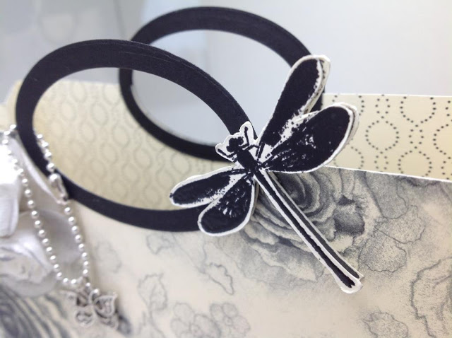 La libellule est un tampon du set de tampons Awesomely Artistic, j’ai fait une première empreinte avec de l’encre Memento que j’ai collée sur la pochette, puis une deuxième avec de la Versamark embossée avec la poudre noire et collée sur la première avec des mousses 3D.