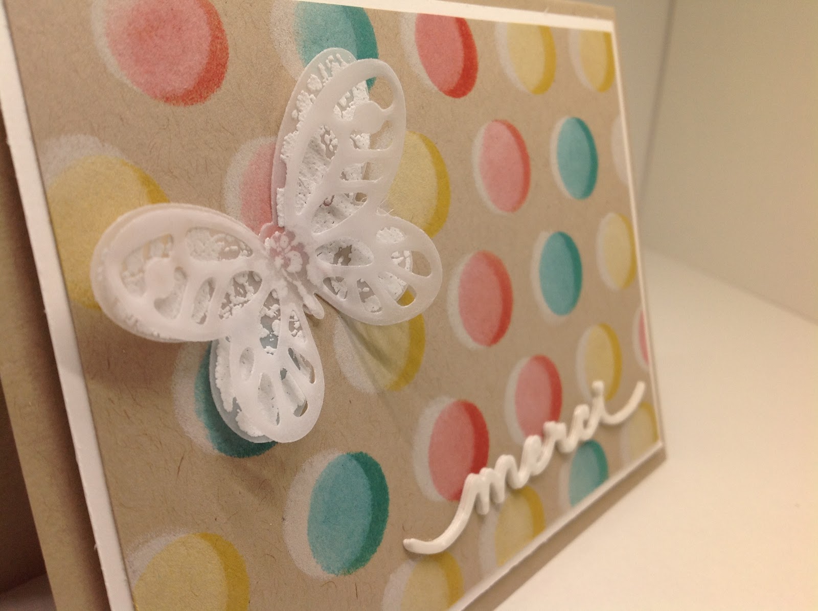 Lorsque l’encre est bien sèche, il suffit de positionner le pochoir en le décalant, puis d’appliquer de la même façon les encres de couleur. Le rendu est très sympa, et mis à part le temps de séchage le fond de carte est fait en un rien de temps !