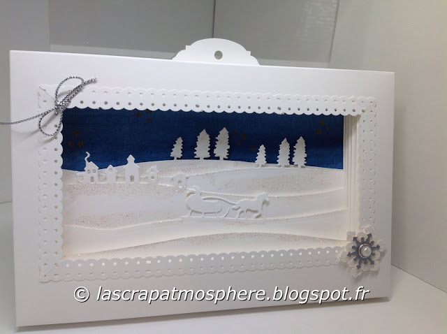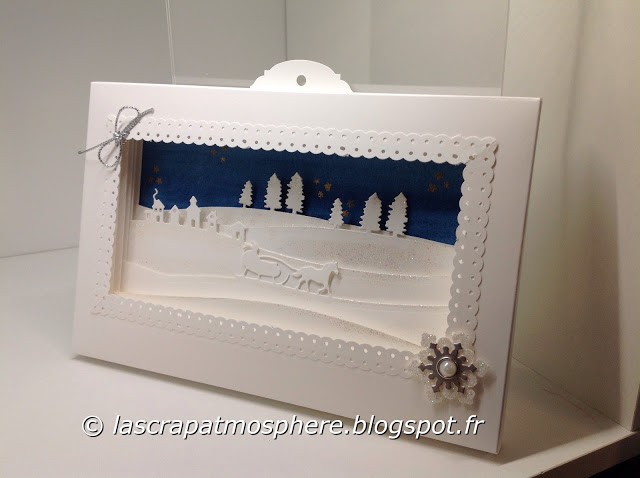 Je n’ai pas résisté au plaisir de réutiliser mes poinçons Tour en Traineau, la recette est à peu près la même que pour ma première réalisation mais cette fois j’ai glissé mon cadre dans une boite que j’ai faite avec l’Insta Enveloppe. J’ai habillé la fenêtre avec des bandes de papier que j’ai perforées avec une perfo que Stampin’Up! ne vend plus hélas, je trouve que ça fait une jolie finition…