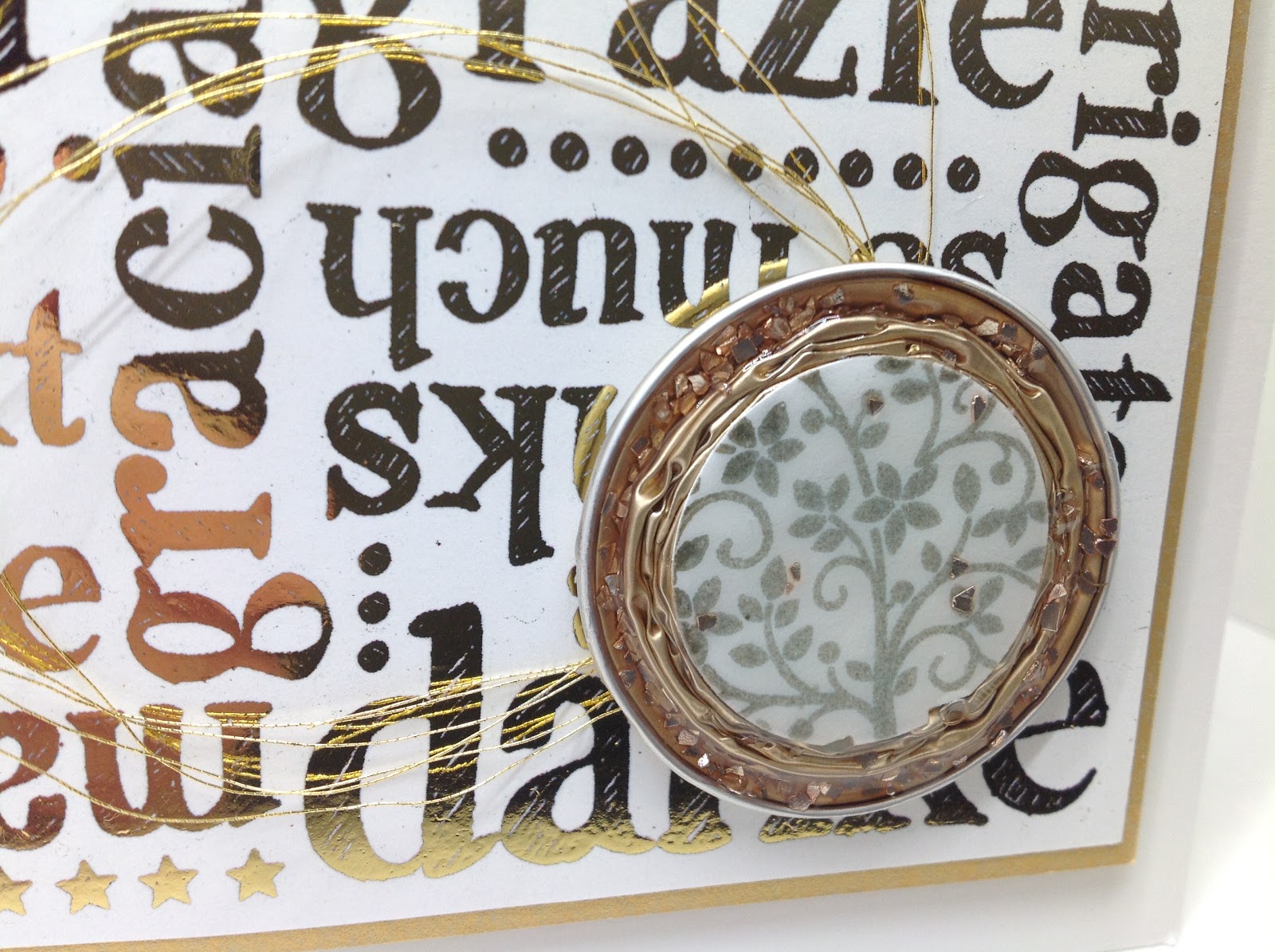 Non, cette dorure n’est pas de l’embossage à chaud … mais un de mes premiers essais de mon cadeau de Noël, la super machine Minc de Heidi Swapp qui permet d’appliquer une pellicule brillante (ici du doré). Oui j’ai été super raisonnable car j’ai reçu ma machine début décembre et je pensais bien être incapable de résister à la tentation de l’essayer avant l’heure, mais mon emploi du temps en a décidé autrement et je n’ai pu essayer mon nouveau jouet que le 31 décembre !
