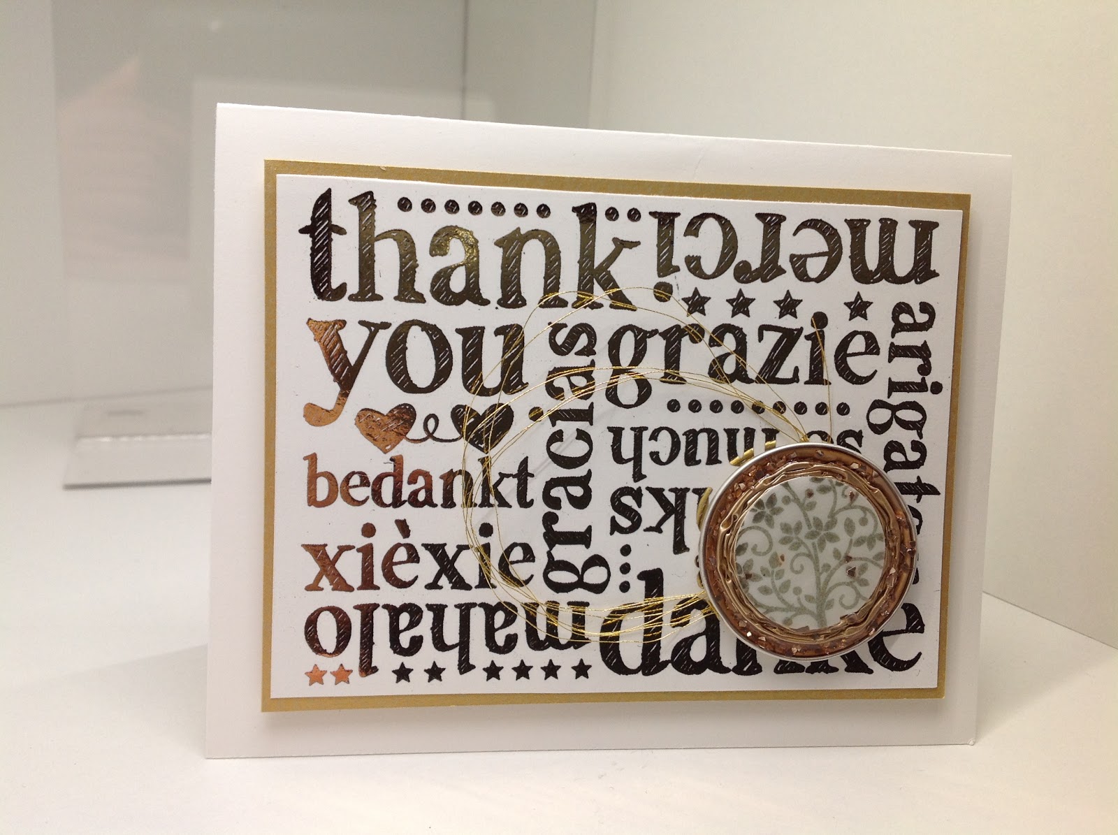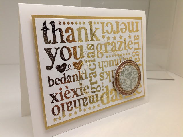 Voici une carte de remerciements que j’ai réalisée avec le superbe tampon d’arrière-plan A World of Thanks (p. 15 du gros catalogue)…