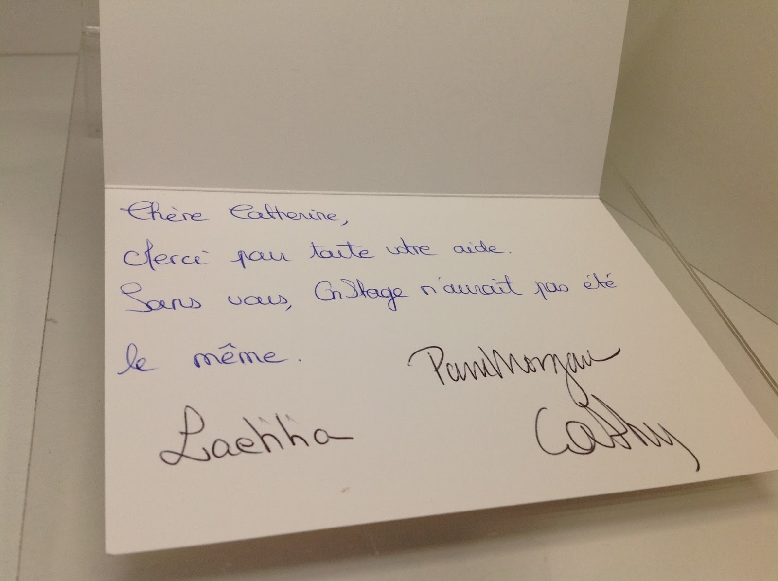 Et pour finir ce post, voici une autre attention qui m’a beaucoup touchée, une petite carte de remerciements signée de Pam Morgan, Laetitia Burth notre Business Development Manager France, et Cathy Schneider.