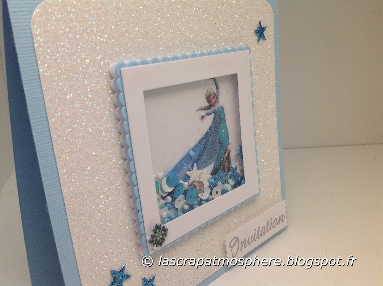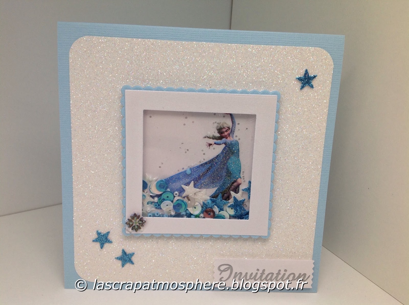 Aujourd’hui je vous montre une nouvelle carte à secouer, du sur-mesure avec thème imposé… la Reine des Neiges! Lorsque ma belle-fille a vu les cartes à secouer que j’avais réalisées pour OnStage, elle a craqué et m’a demandé de faire les invitations d’anniversaire pour les 5 ans de ma petite-fille Sarah , alors voici mon premier prototype