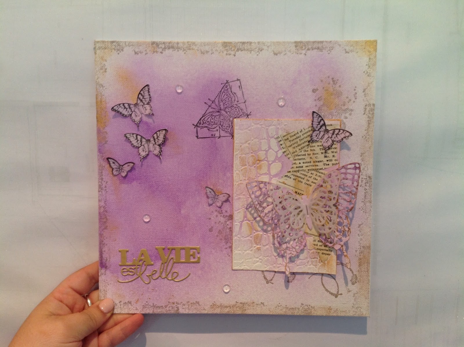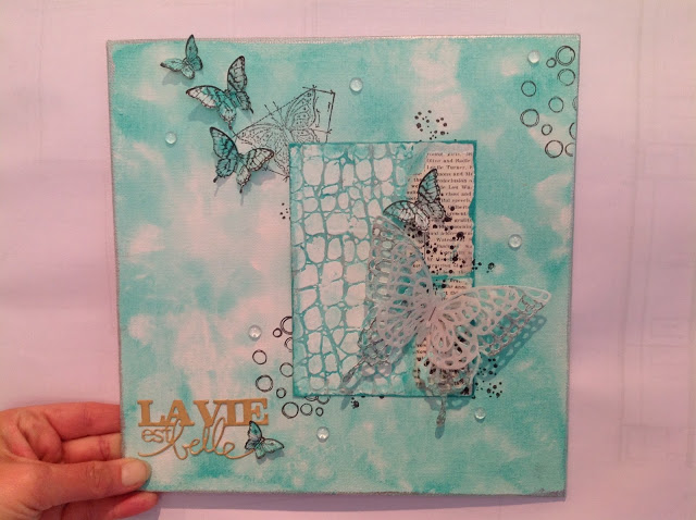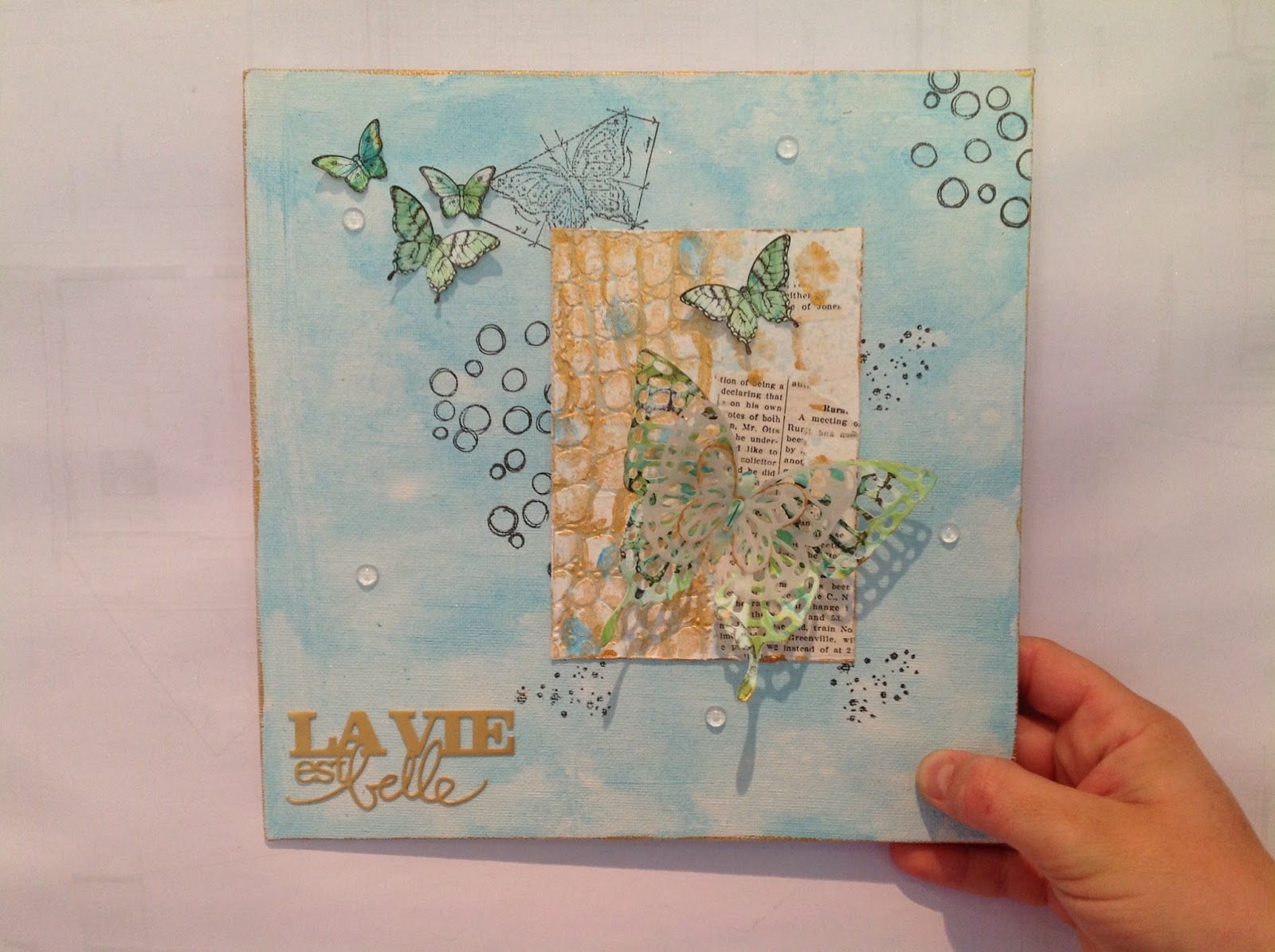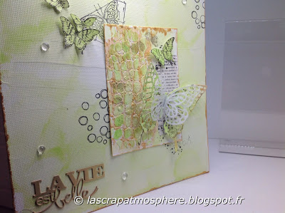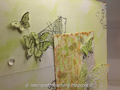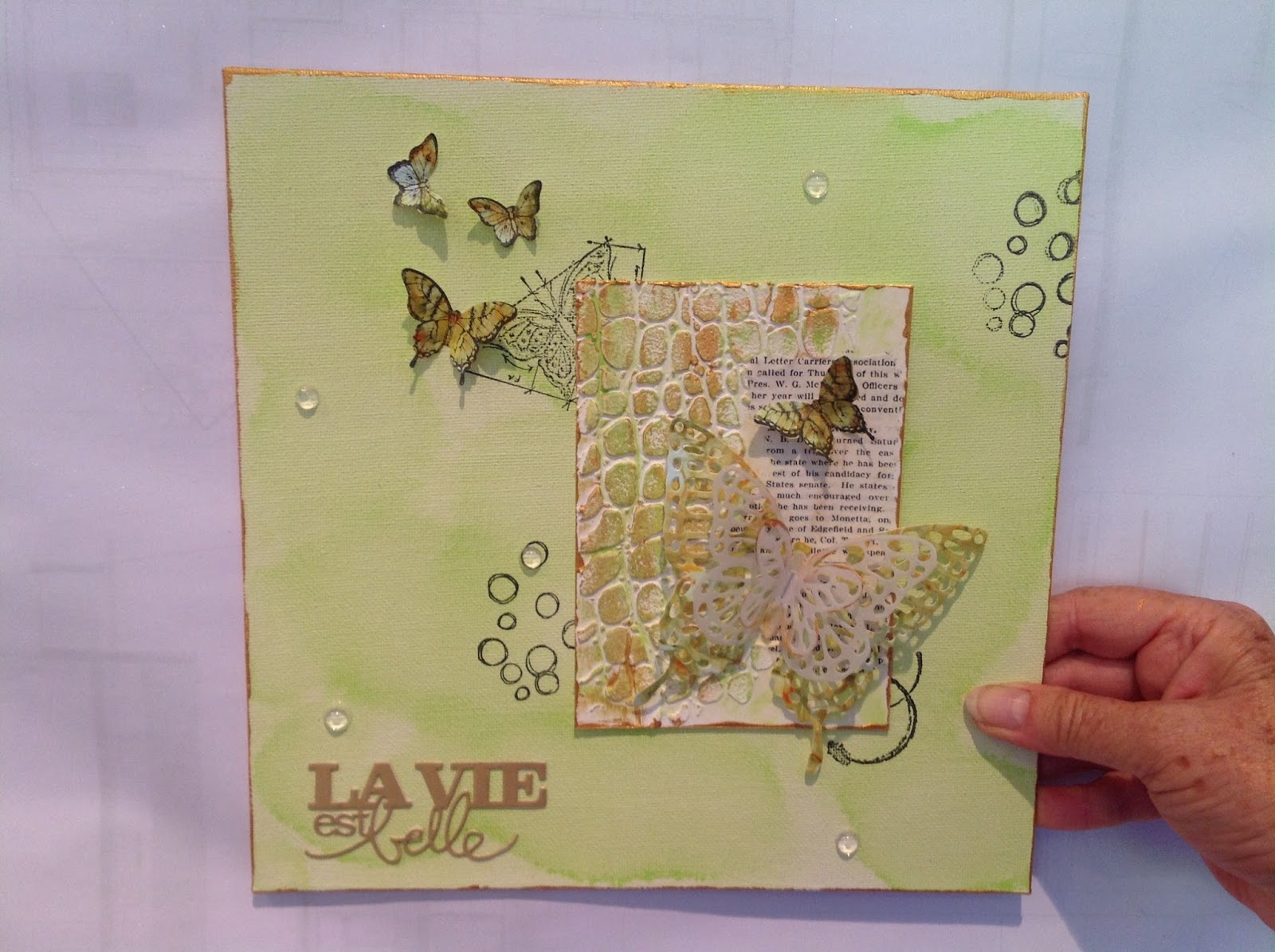 Après cette brillante démonstration nous avons repris l’activité commencée au départ, notre fond pschitté et notre pâte de structure étant maintenant secs nous pouvons continuer à travailler le fond avec encre et tampons, peinture, un peu de collage et fabrication de papillons pour finir la déco…