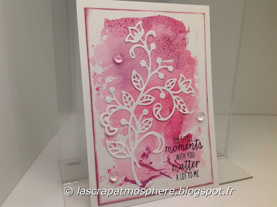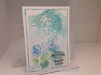 J’ai travaillé les fonds sur du ppaier aquarelle, avec les encres liquides, puis j’ai encré les contours au doigt mousse. Pour la décoration j’ai utilisé différents framelits, mais tous découpés dans du papier Murmure Blanc : Thinlits En Fleur, thinlits Tourbillonnants et thinlits Vœux ensoleillés.