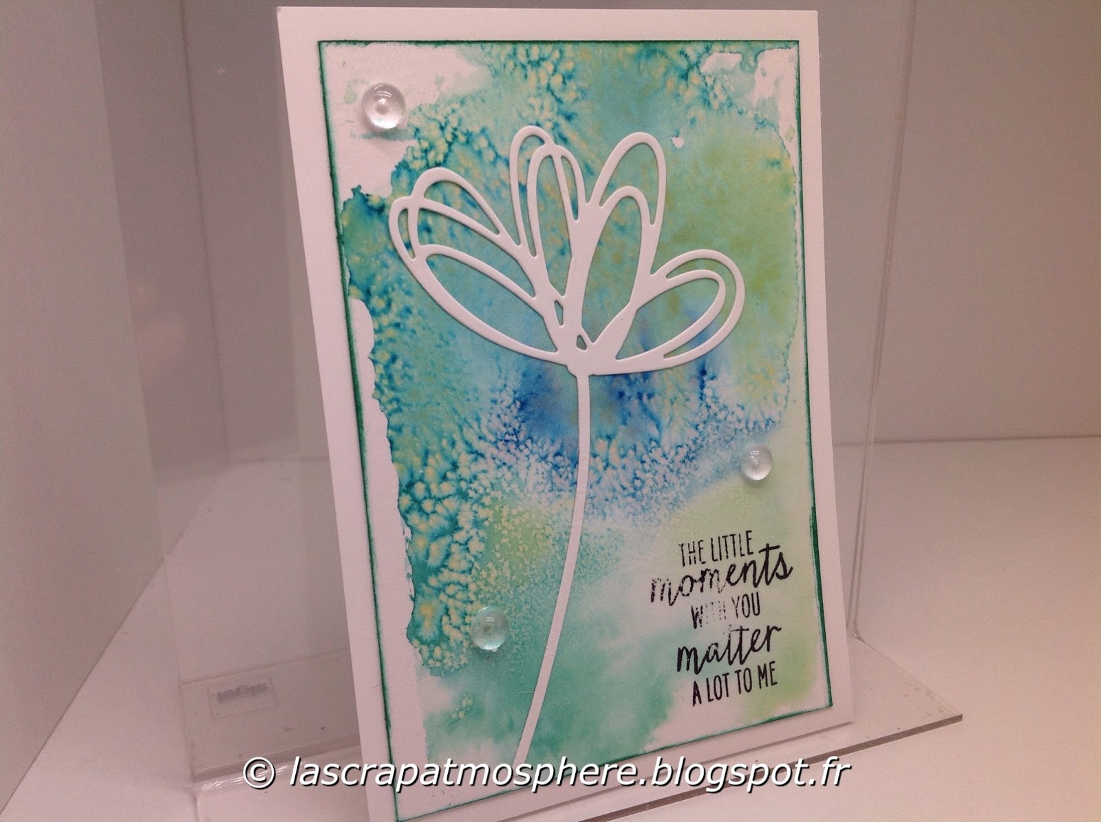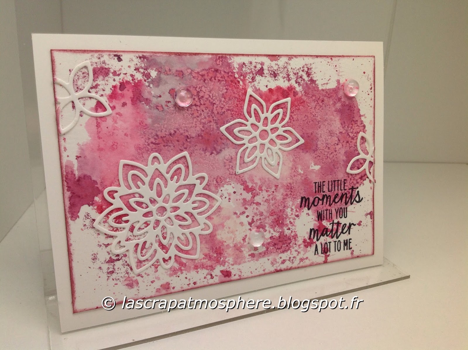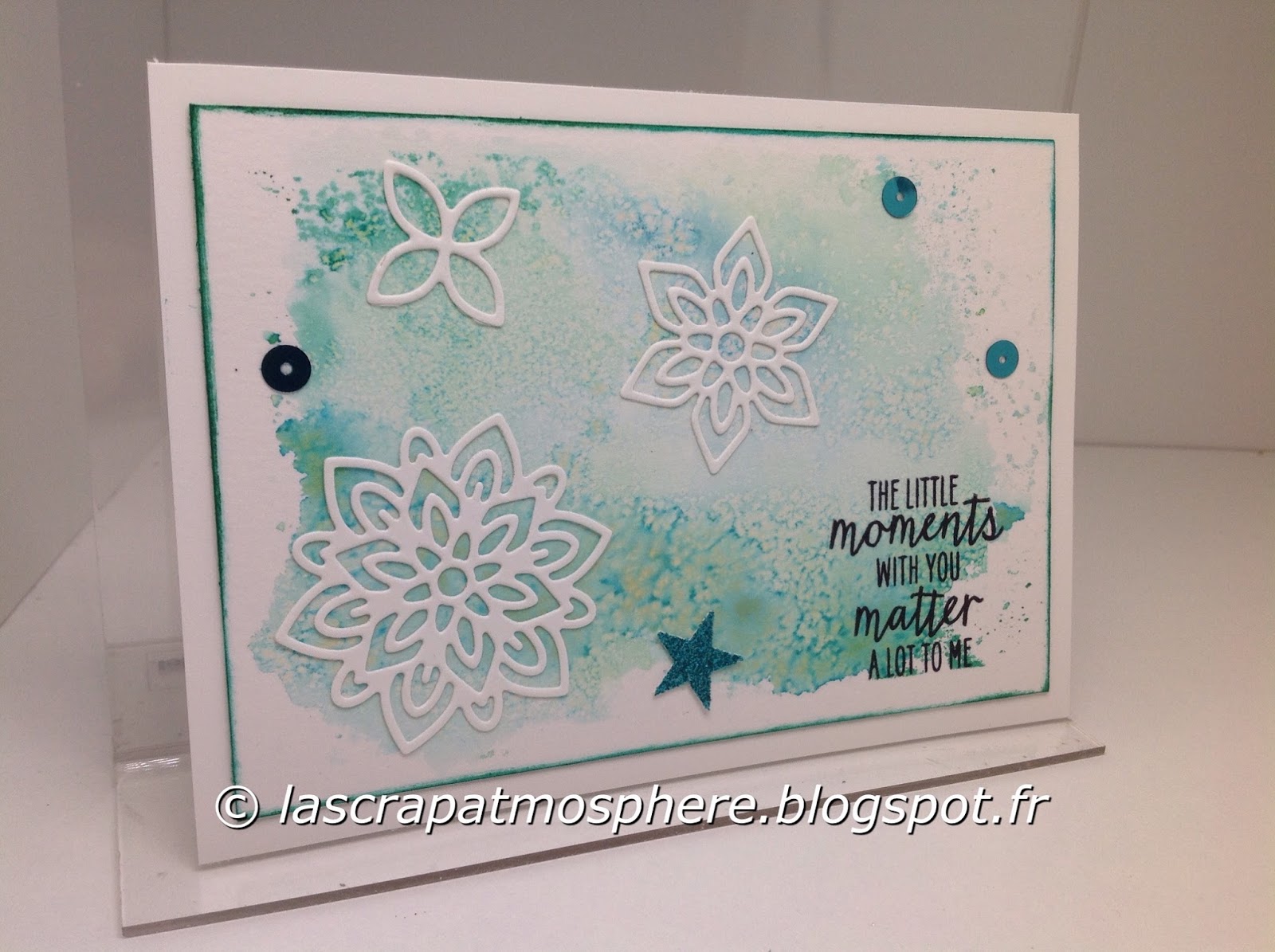 J’ai travaillé les fonds sur du ppaier aquarelle, avec les encres liquides, puis j’ai encré les contours au doigt mousse. Pour la décoration j’ai utilisé différents framelits, mais tous découpés dans du papier Murmure Blanc : Thinlits En Fleur, thinlits Tourbillonnants et thinlits Vœux ensoleillés.