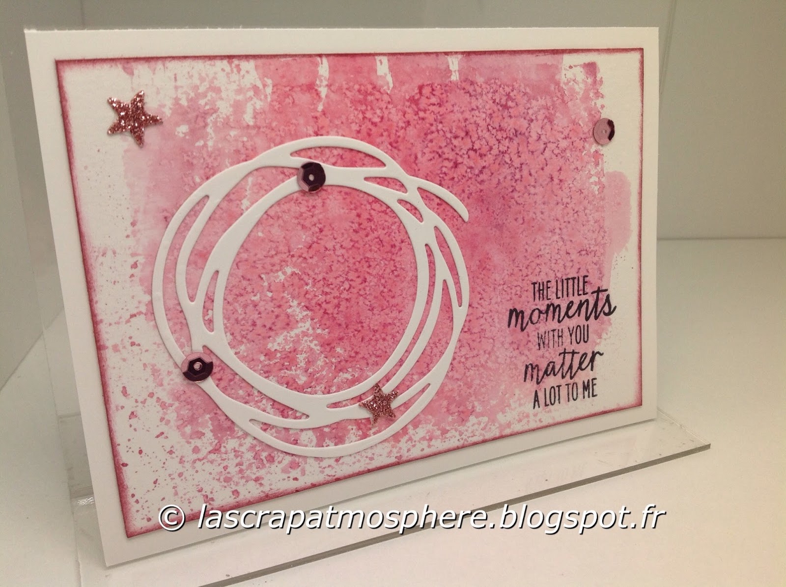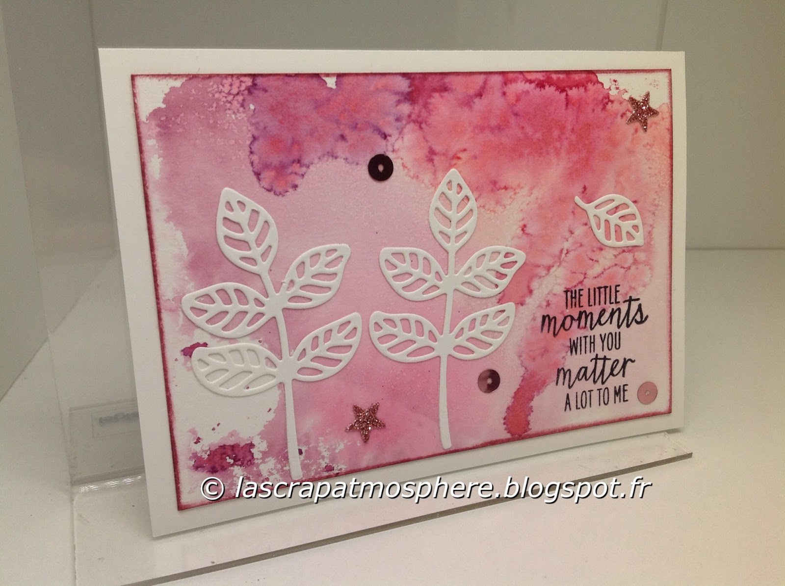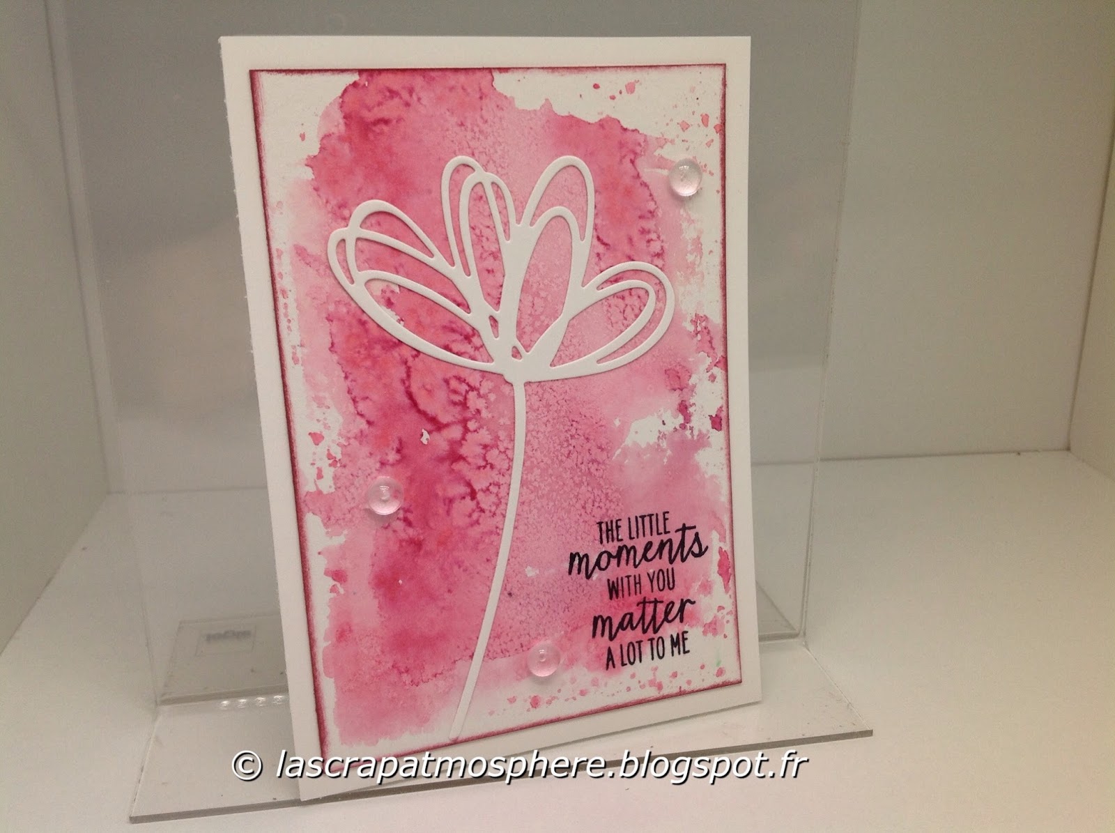 J’ai travaillé les fonds sur du ppaier aquarelle, avec les encres liquides, puis j’ai encré les contours au doigt mousse. Pour la décoration j’ai utilisé différents framelits, mais tous découpés dans du papier Murmure Blanc : Thinlits En Fleur, thinlits Tourbillonnants et thinlits Vœux ensoleillés.