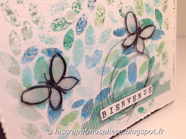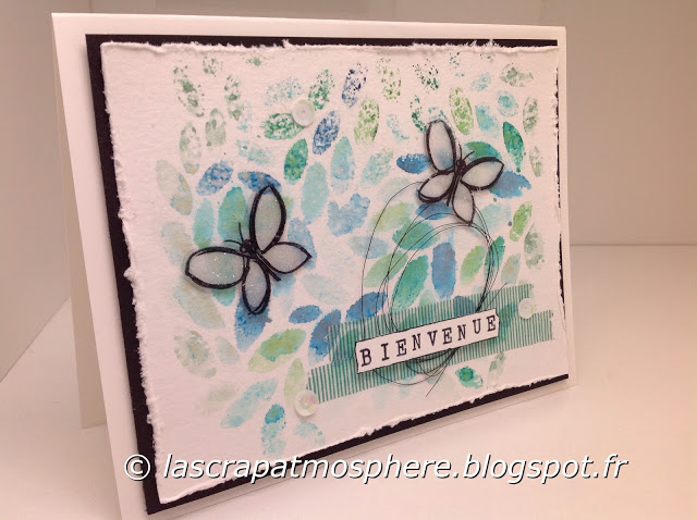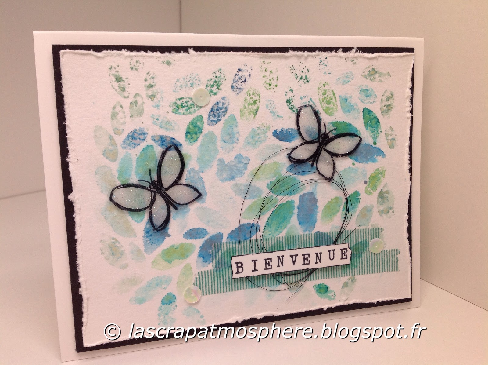 J’ai réalisé le fond de carte sur du papier aquarelle, avec le classeur de gaufrage « Les pétales s’étalent » qui m’a servi d’outil d’impression…J’ai ajouté du masking tape (collection Palette enjouée), du fil Touche métallisée noir, quelques sequins (pour changer LOL), deux papillons faits sur du papier fenêtré (tuto ici) et le mot « bienvenue » composé avec le tampon rotatif (que l’on peut remplacer par le set de tampons Labeler Alphabet). Un peu d’usure sur les bords du papier aquarelle, un fond noir et une base de carte Murmure blanc…vous savez tout !
