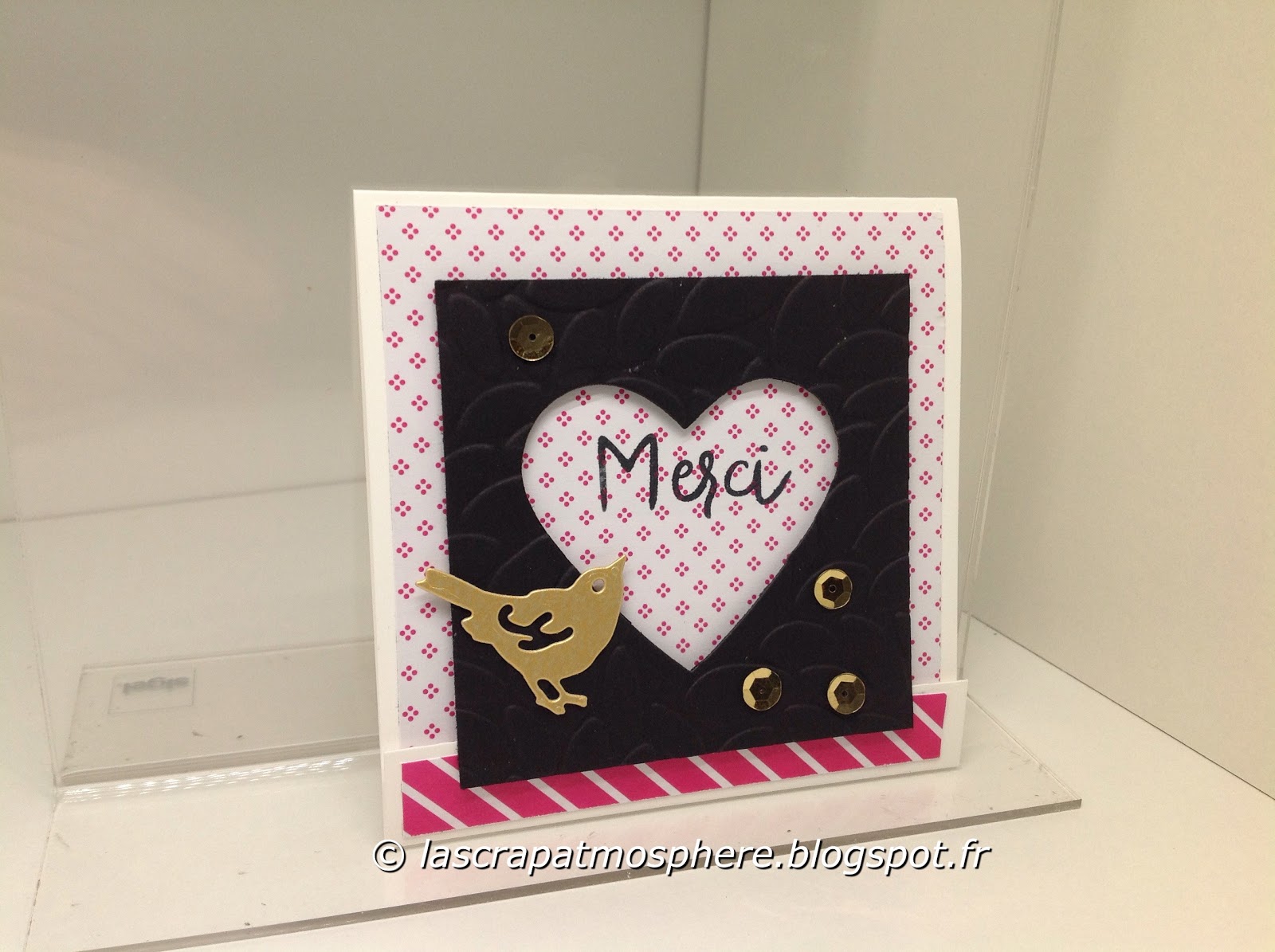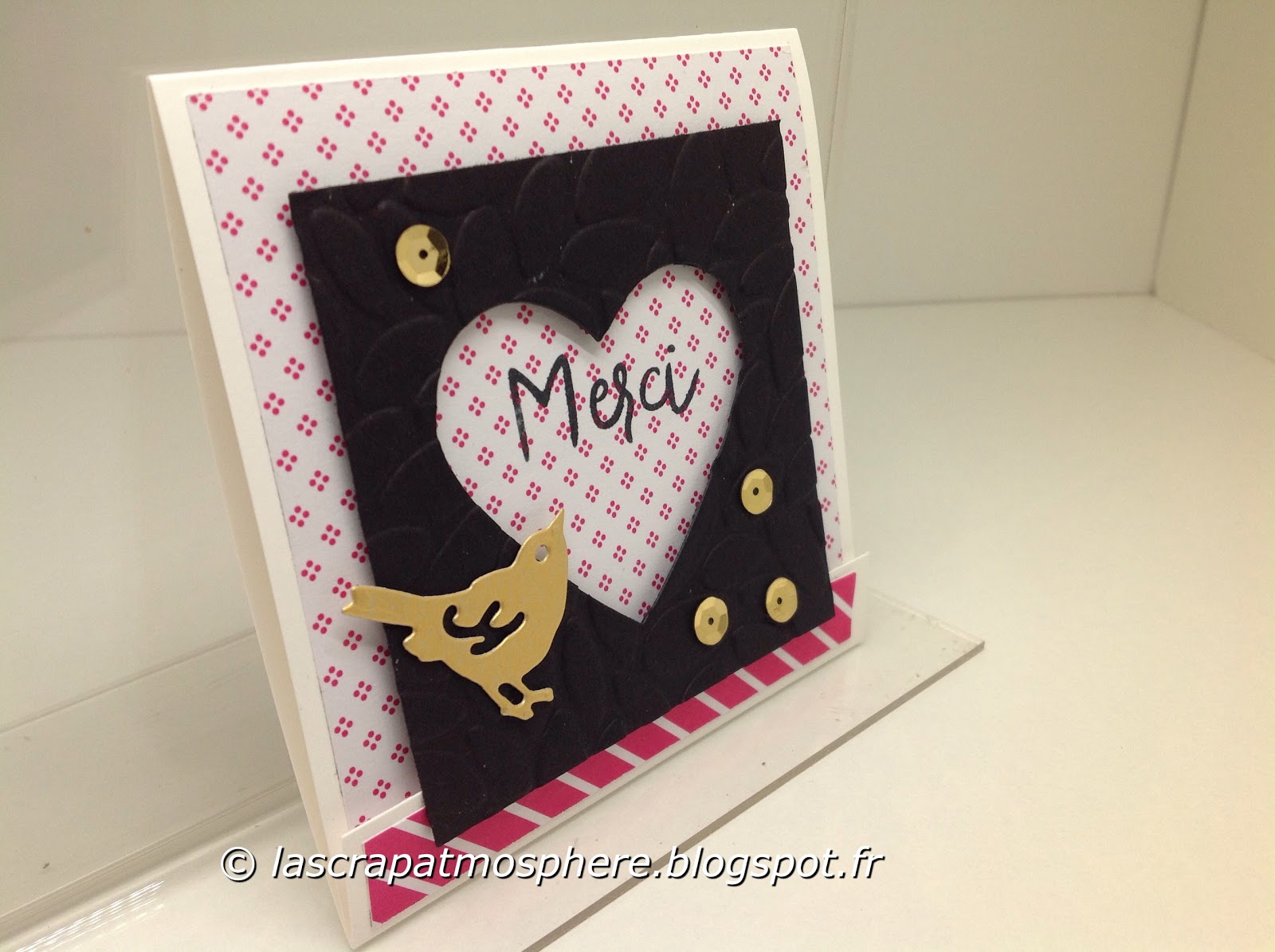 J’ai fait le choix d’une mini-carte (elle fait environ 9×9 cm) et j’ai utilisé les papiers du set Touche de rose.