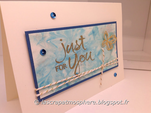 C’est l’un de mes échantillons que j’ai utilisé pour créer cette carte, ce n’était vraiment qu’une chute mais je l’ai gardée grâce au réflexe du « tout peut servir »… Puis de retour de chez Sonia, en rangeant mon petit bazar, j’ai trouvé qu’il était vraiment joli ce petit fond alors j’ai décidé de le valoriser… je l’ai adossé un à rectangle de notre nouvelle teinte de bleu Denim Dandy sur une base de carte Murmure blanc… j’ai embossé à la poudre or l’un des gros tampons du set Watercolor words (un set que j’aime particulièrement), ajouté de la ficelle à rôti or, une petit papillon découpé avec un des thinlits du set Vœux ensoleillés dans du papier or et collé quelques sequins bleu foncé…