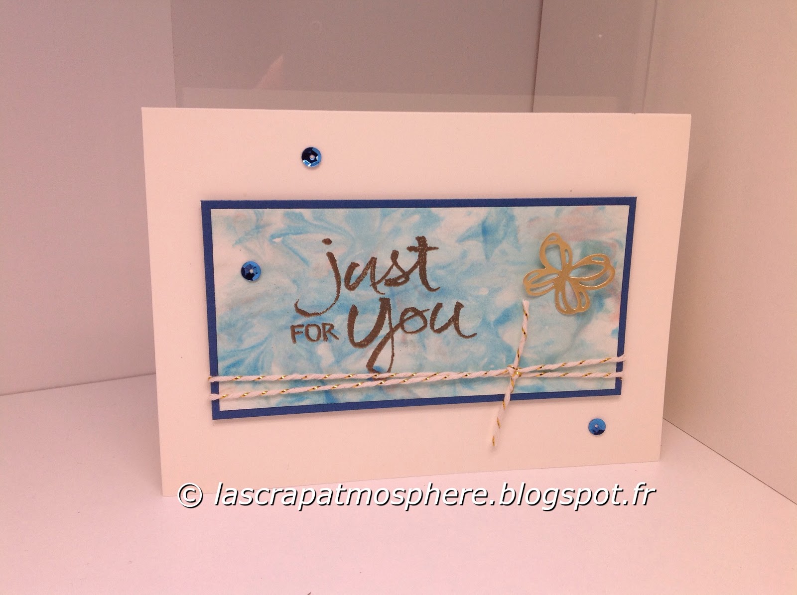C’est l’un de mes échantillons que j’ai utilisé pour créer cette carte, ce n’était vraiment qu’une chute mais je l’ai gardée grâce au réflexe du « tout peut servir »… Puis de retour de chez Sonia, en rangeant mon petit bazar, j’ai trouvé qu’il était vraiment joli ce petit fond alors j’ai décidé de le valoriser… je l’ai adossé un à rectangle de notre nouvelle teinte de bleu Denim Dandy sur une base de carte Murmure blanc… j’ai embossé à la poudre or l’un des gros tampons du set Watercolor words (un set que j’aime particulièrement), ajouté de la ficelle à rôti or, une petit papillon découpé avec un des thinlits du set Vœux ensoleillés dans du papier or et collé quelques sequins bleu foncé…