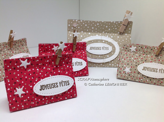 Pour la fermeture, j’ai choisi une mini épingle à linge sur laquelle j’ai collé une petite étoile perforée dans du papier à paillettes Diamants resplendissants, petit rappel de la déco (très simple) de la boîte.