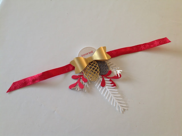 J’ai collé une petite composition avec nœud sur un cercle tamponné, puis j’ai fixé l’ensemble sur un morceau de ruban d’environ 20cm de long (à adapter si besoin…) à l’aide de mon pistolet à colle.