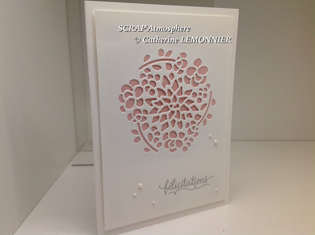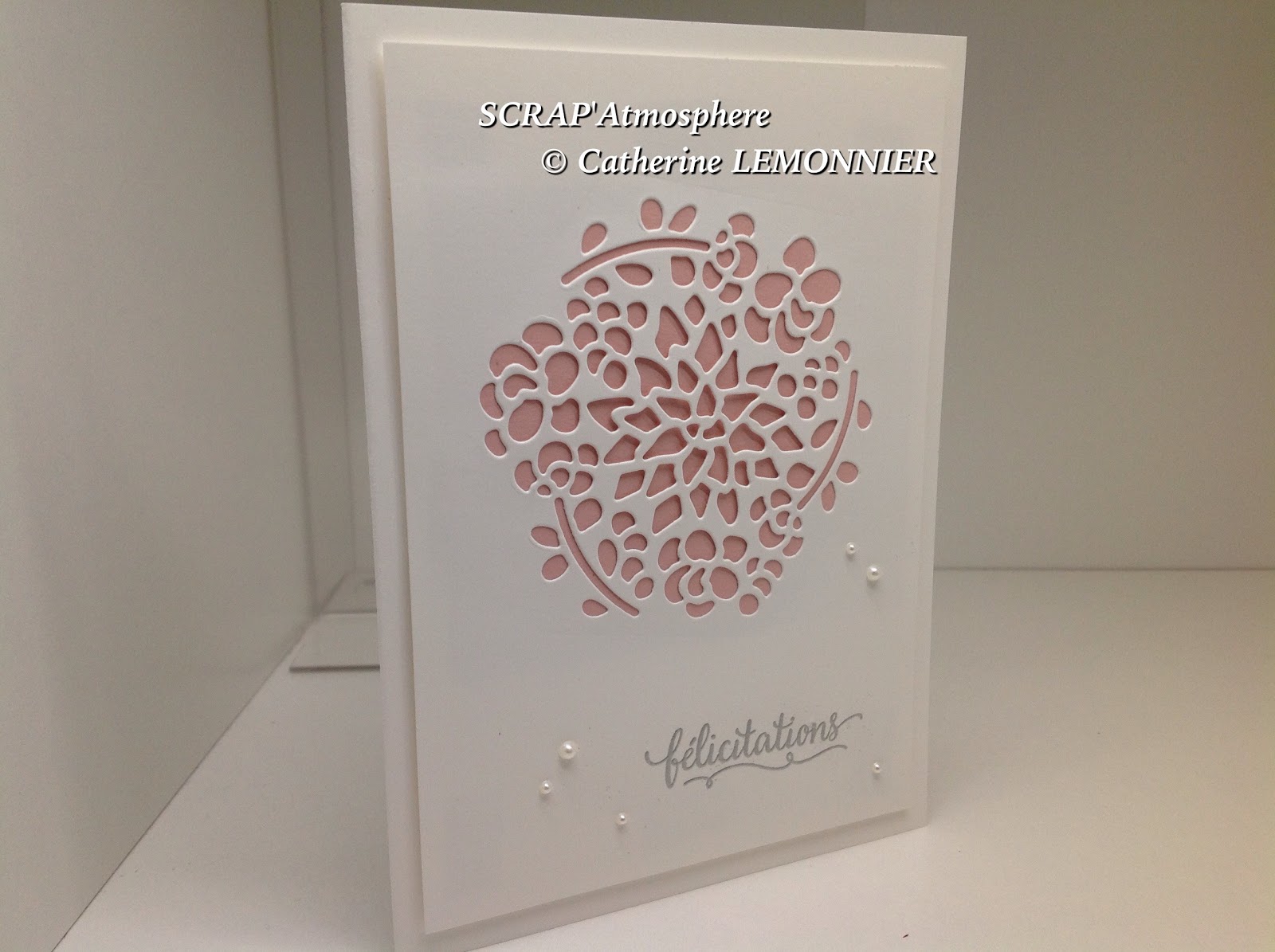 J’ai simplement placé un morceau de papier Fleur de Cerisier sous la découpe… J’ai collé quelques perles et ajouté un message embossé à chaud à la poudre Argent avec ce très beau tampon du set Amour Fou.
