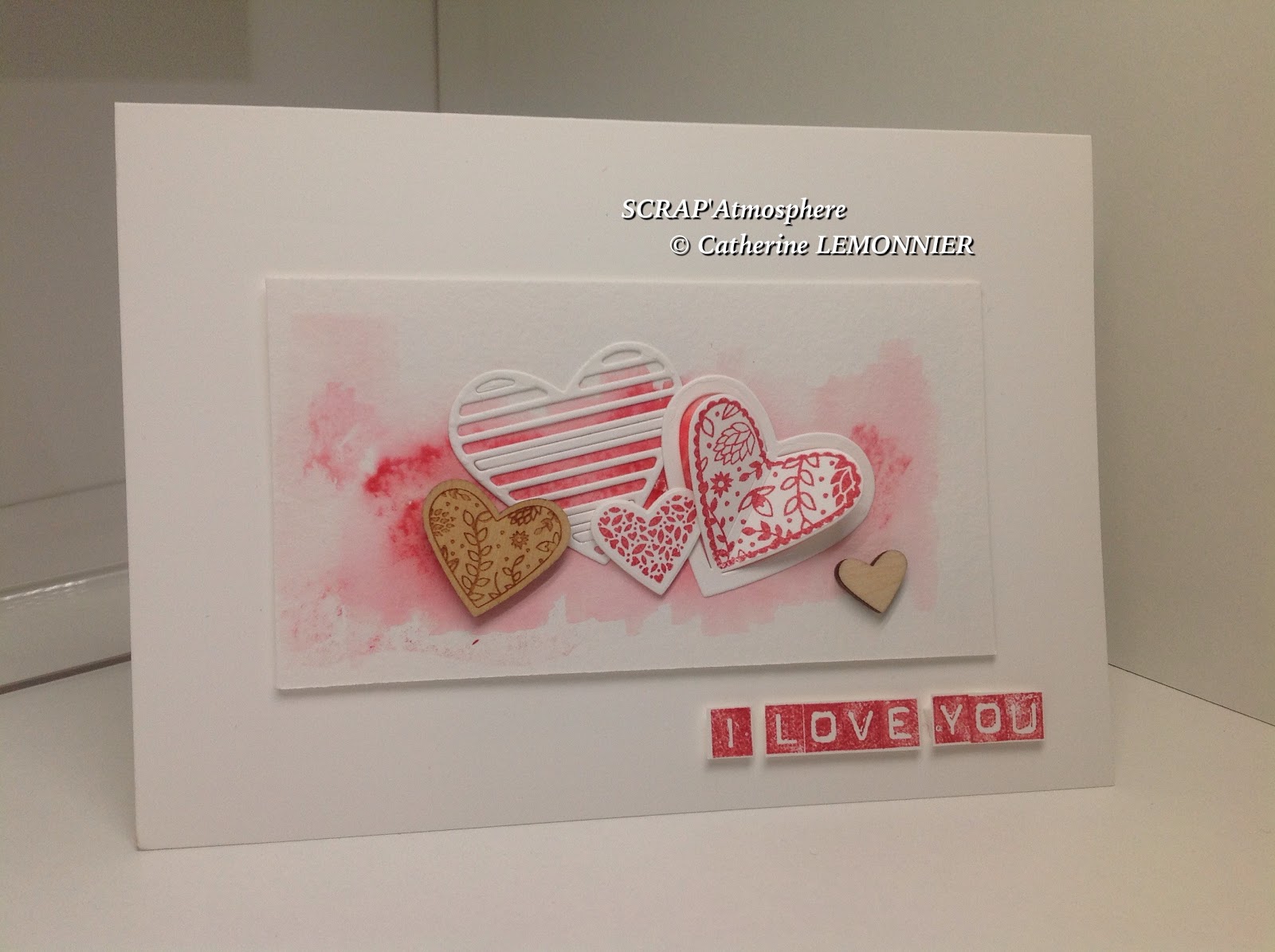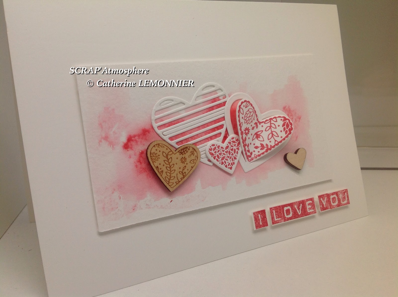Pour ma part je vous propose cette carte où j’ai mis en valeur les framelits et les tampons du lot Scellée d’un baiser, ainsi que les jolis ornement en bois Avec Amour, le tout sur un fond que j’ai créé sur du papier aquarelle…