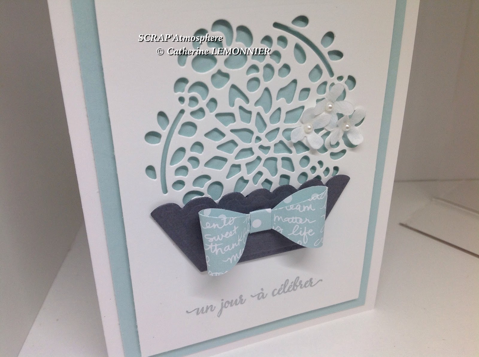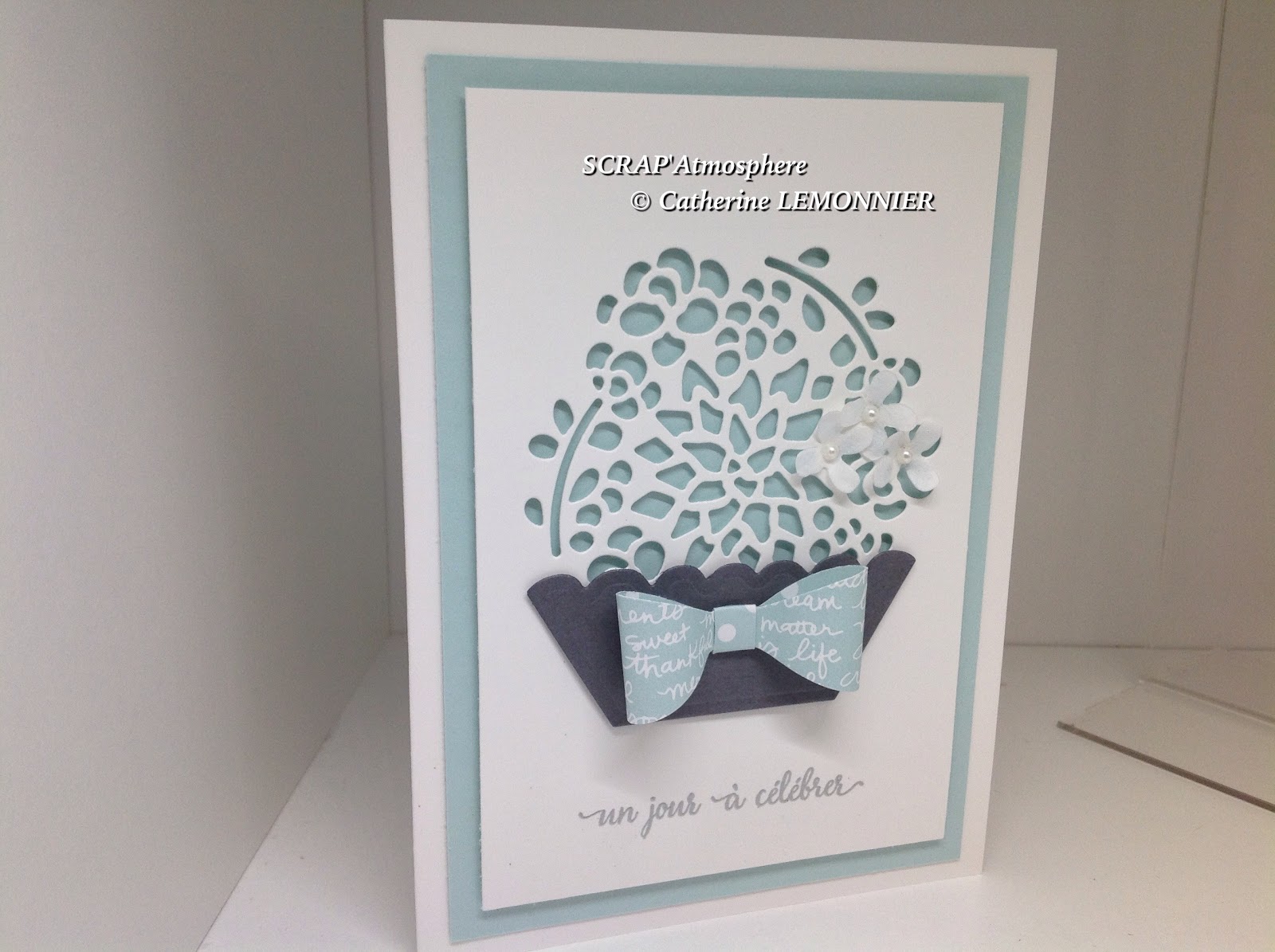 Le grand motif floral est mis en valeur par un fond Doux Ciel. La « jardinière » est découpée dans du papier Gris Souris, et réhaussée d’un joli nœud réalisé avec notre perforatrice Nœud et du papier Design Doux Ciel.