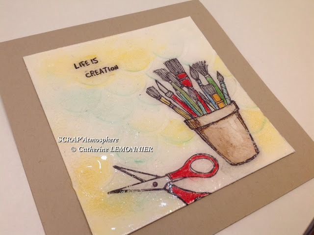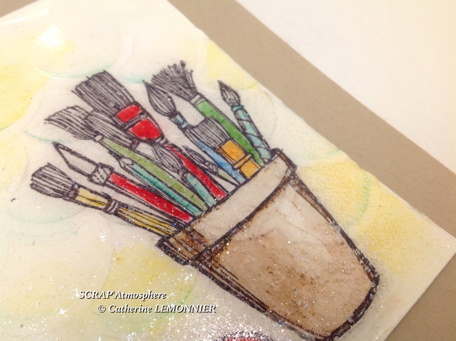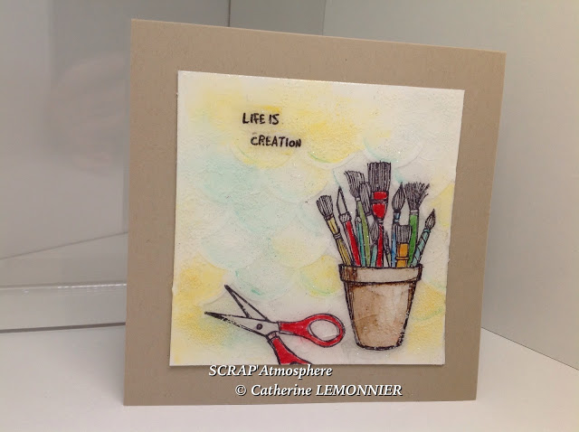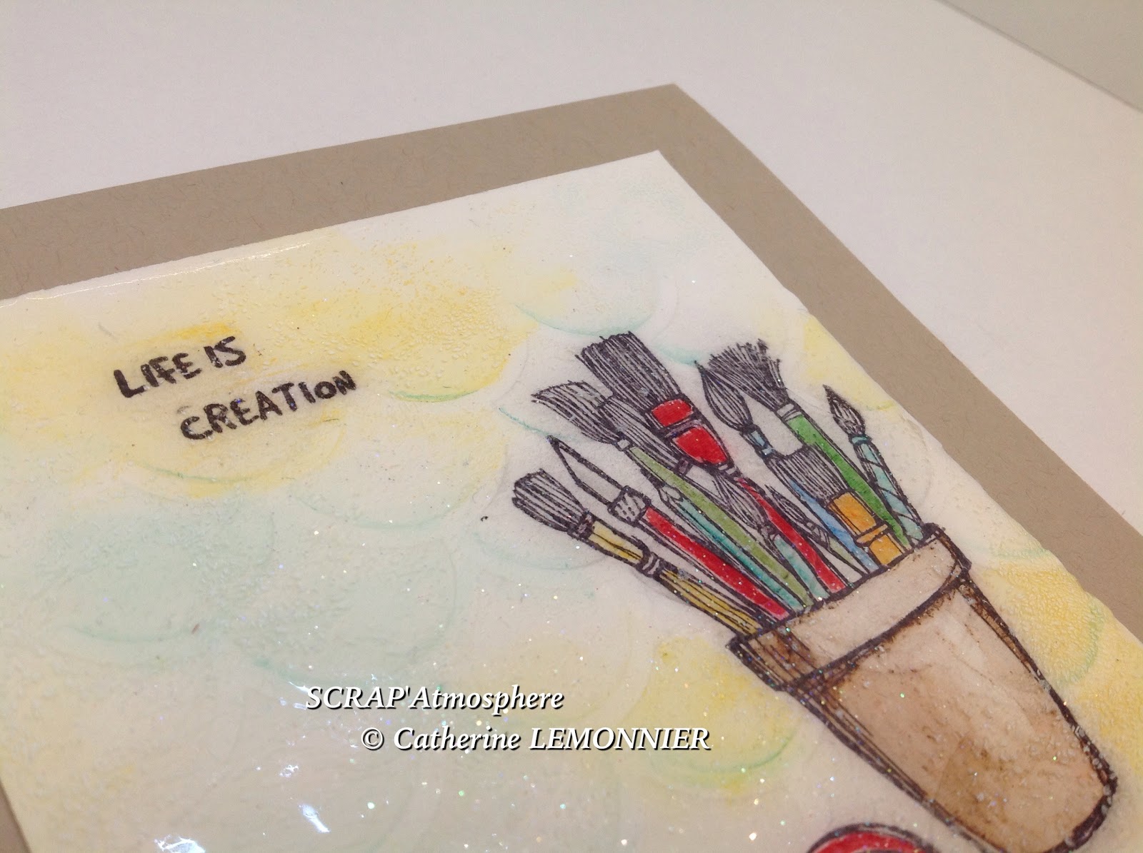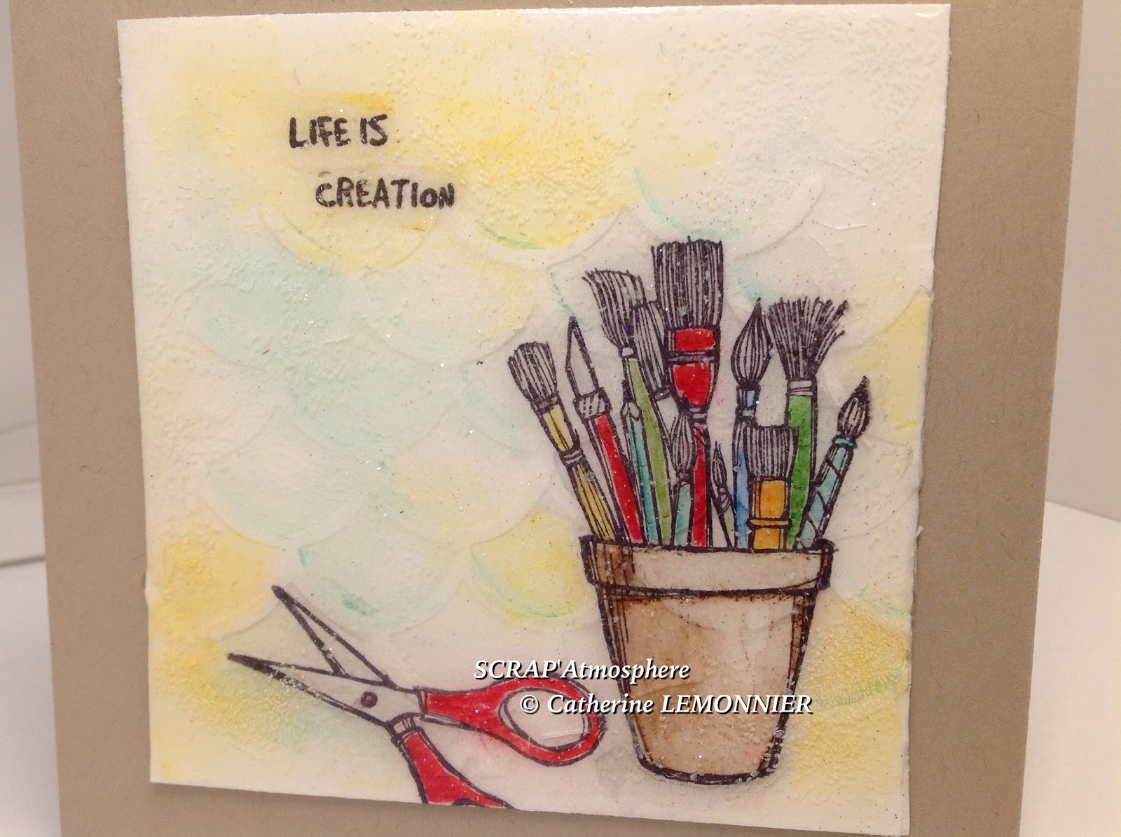 J’ai structuré le fond de carte avec le thinlit Ecailles de Poisson, et utilisé divers medias en mode patouille, j’ai colorié, puis j’ai encapsulé le tout sous une bonne couche de poudre UTEE ! Par contre le texte que j’ai utilisé n’est pas dans le set de tampons, dont les textes sont très sympas et en français… Bah oui j’ai buggé, ça peut arriver !