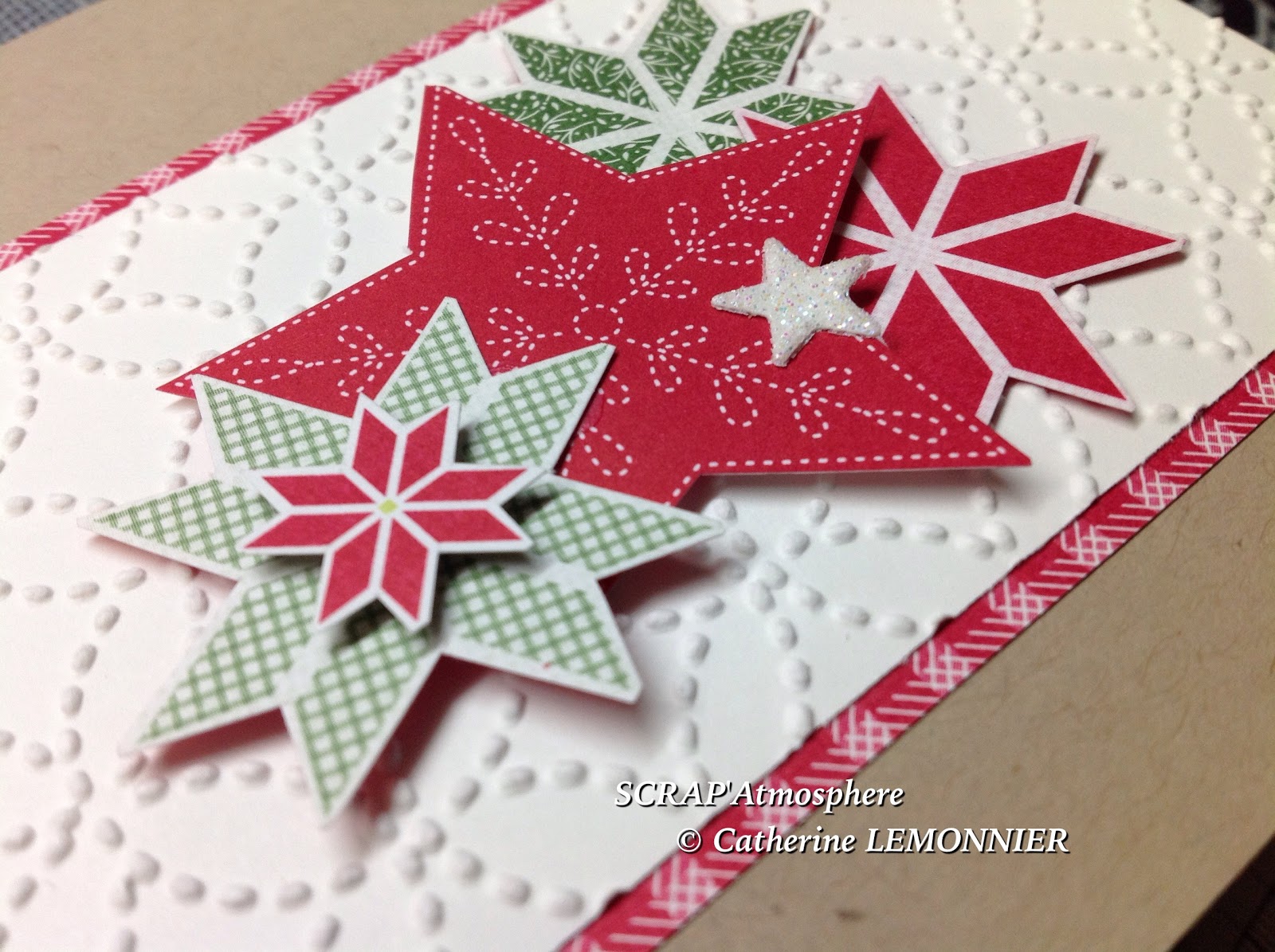 Pour la décoration extérieure, j’ai découpé différentes étoiles dans le papier design Noël Matelassé, et je les ai simplement disposées sur une bande de papier Murmure Blanc embossée avec le très beau plioir de gaufrage Matelassé. Certaines étoiles sont collées avec des Stampin’ Dimensionals pour qu’elles ne soient pas toutes sur le même plan.