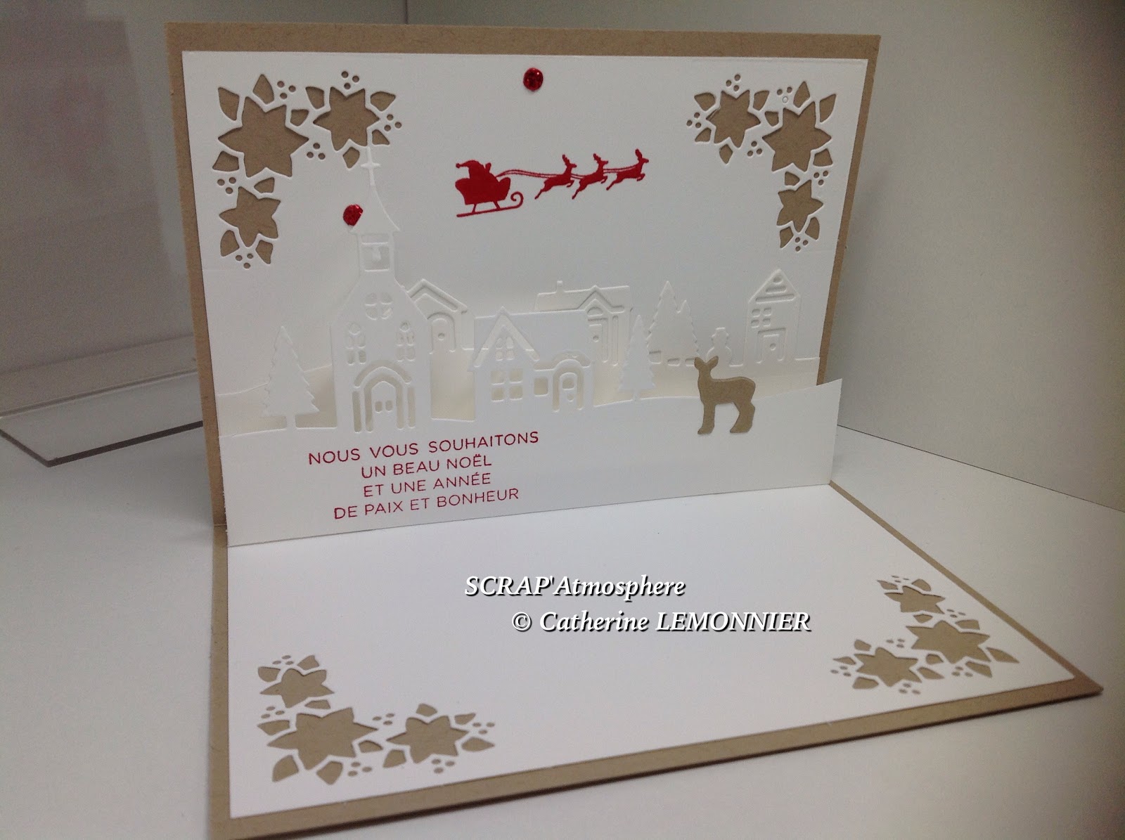 Les 2 autres découpes ont été réalisées avec les poinçons edgelits Bonjour de ma ville, le texte et le traineau du père Noël viennent du set coordonné Ensemble à Noël et ont été tamponnés à l’encre Rouge-rouge.