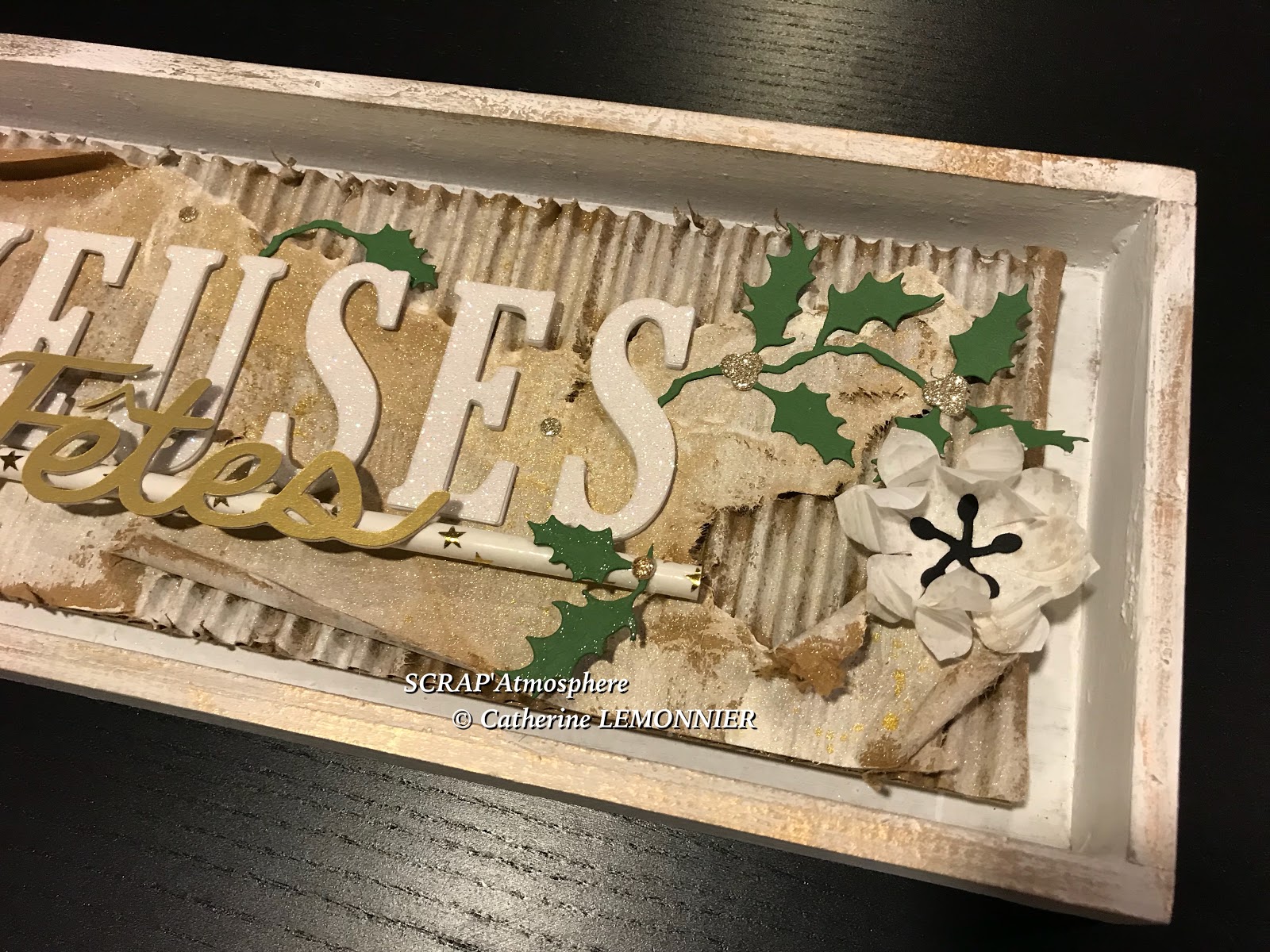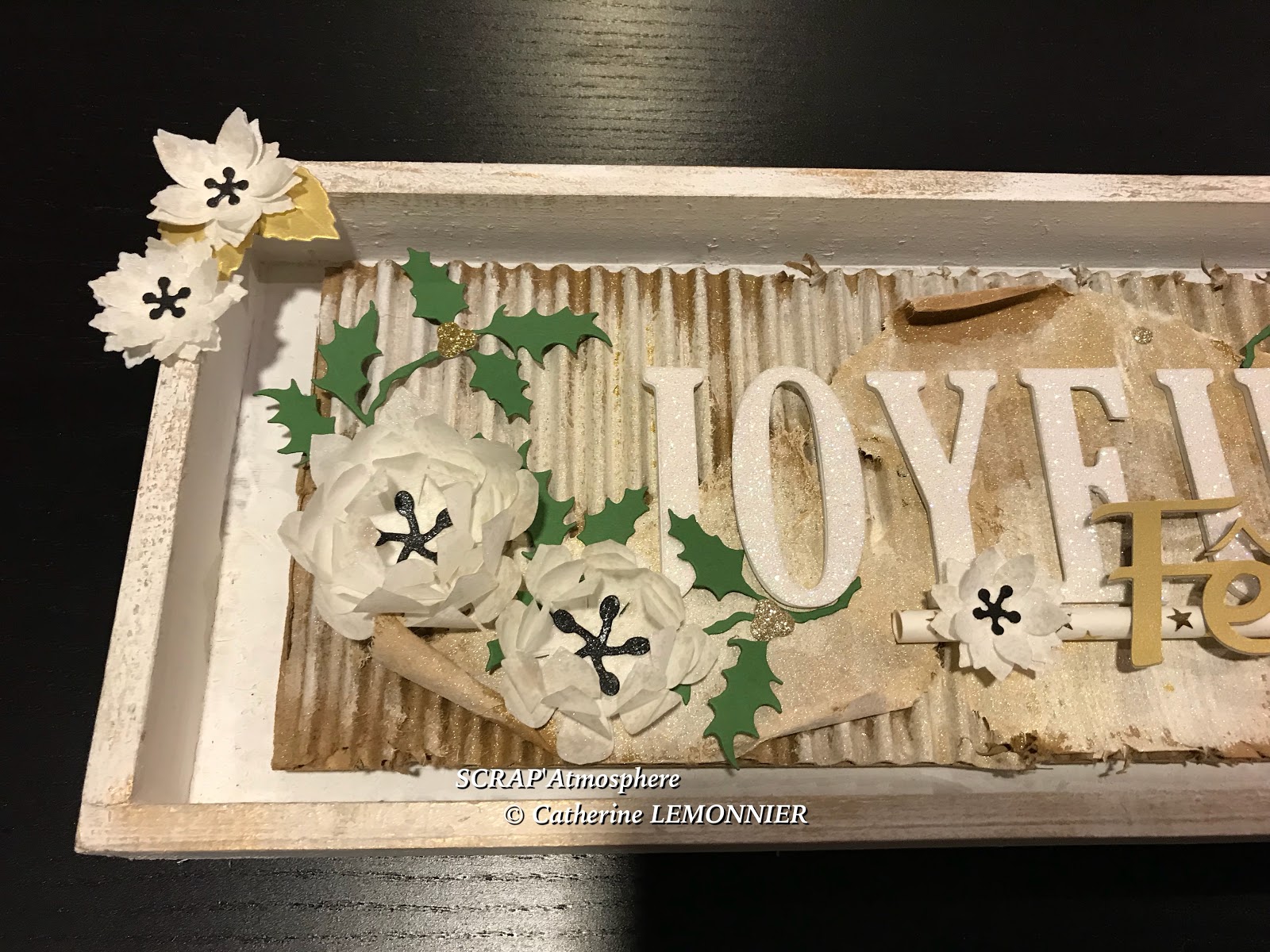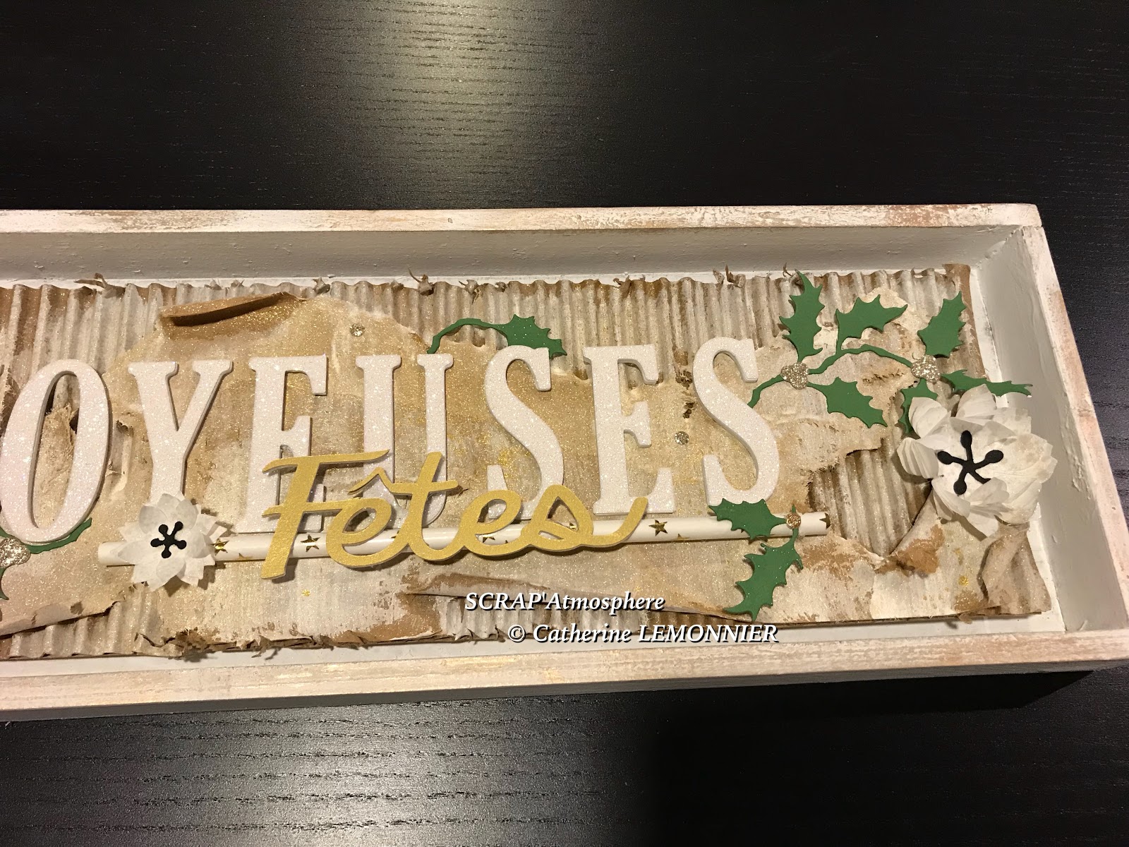 Le mot Joyeuses est souligné par une paille en carton blanc étoilé de doré, qui sert également de support au mot Fêtes que j’ai découpé avec ma Scan n’Cut.
