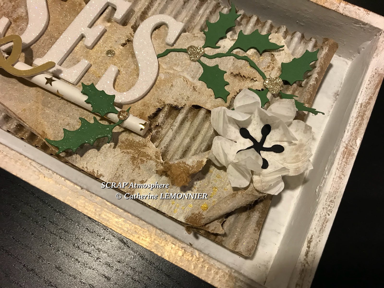 Petite touche finale pour parfaire l’ensemble, nous avons appliqué au doigt un peu de patine dorée sur l’encadrement du plateau…