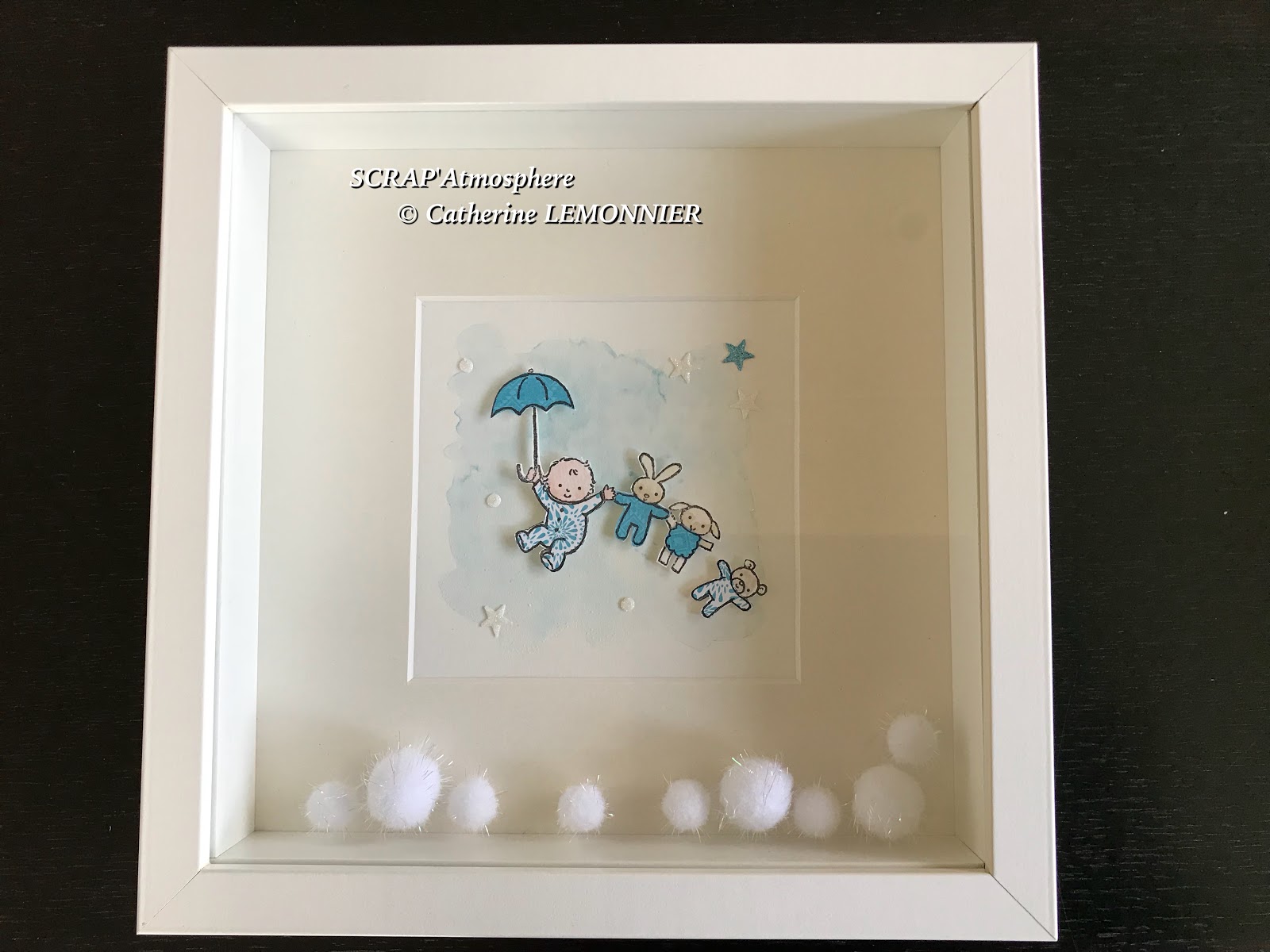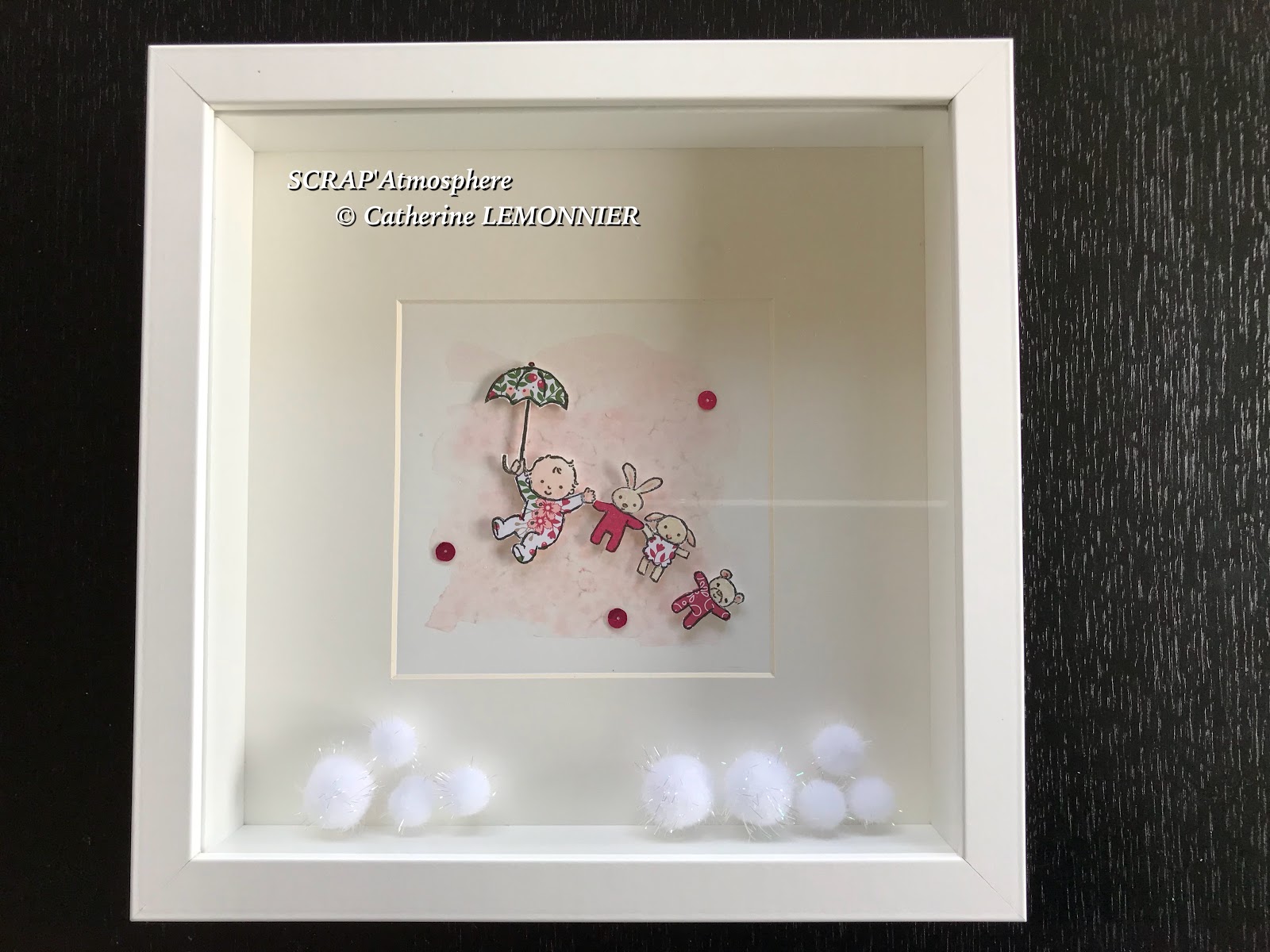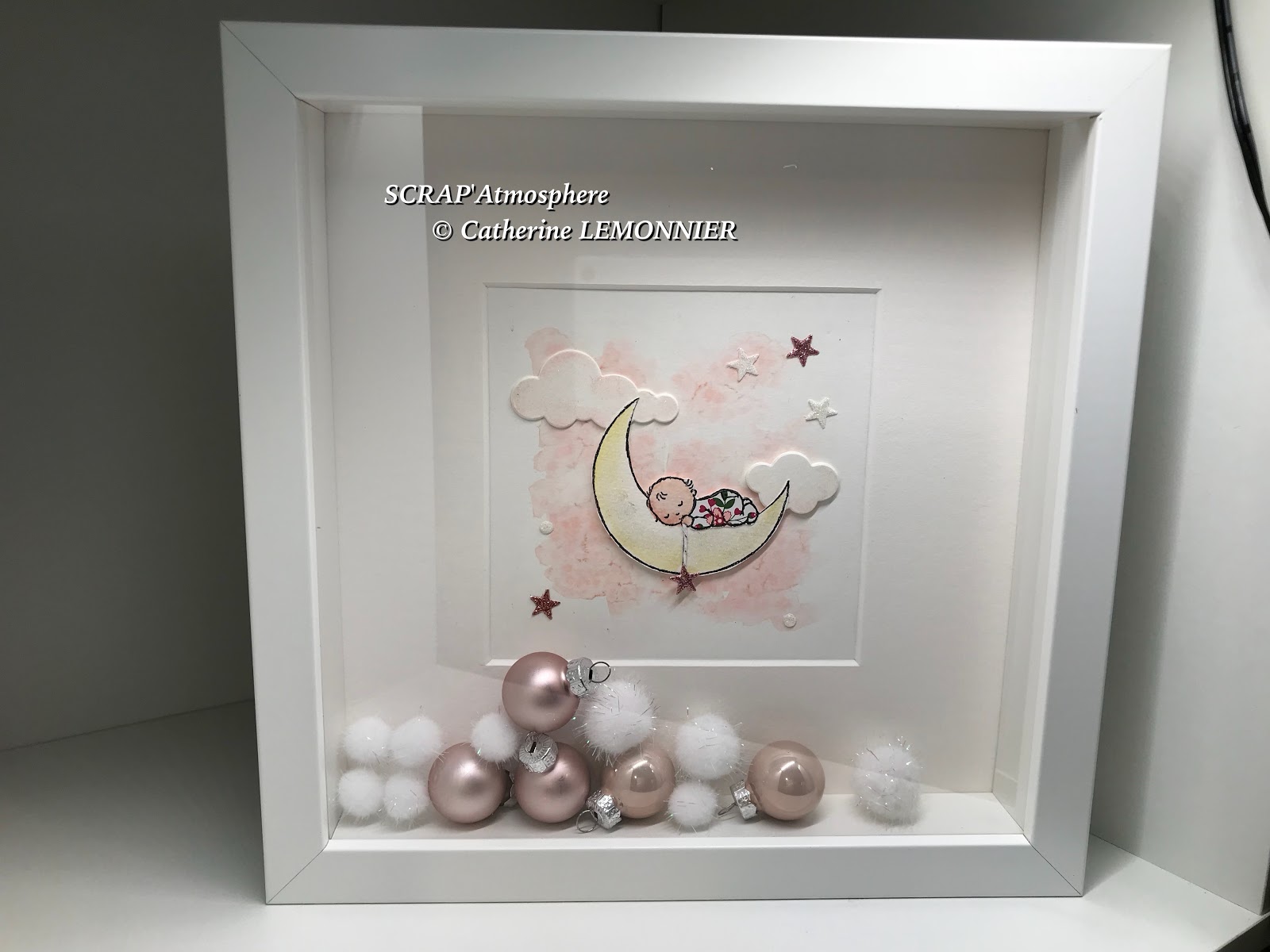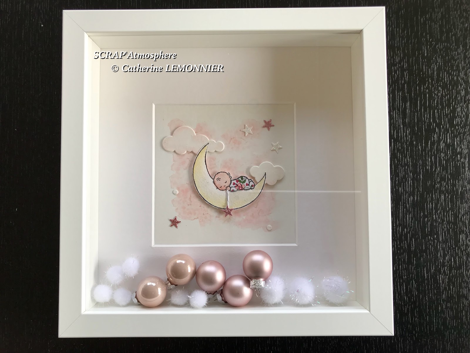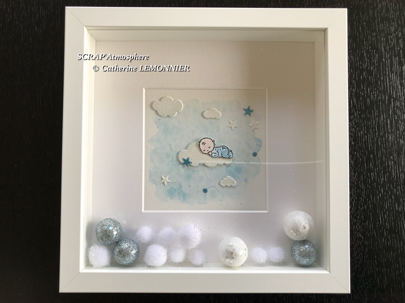 Pour le petit plus, j’ai ajouté des espèces de pompons blancs irisés, ils sont très légers et aériens et meublent la profondeur du cadre, puis suivant les cas des mini boules de Noël dans des couleurs assorties aux dessins…