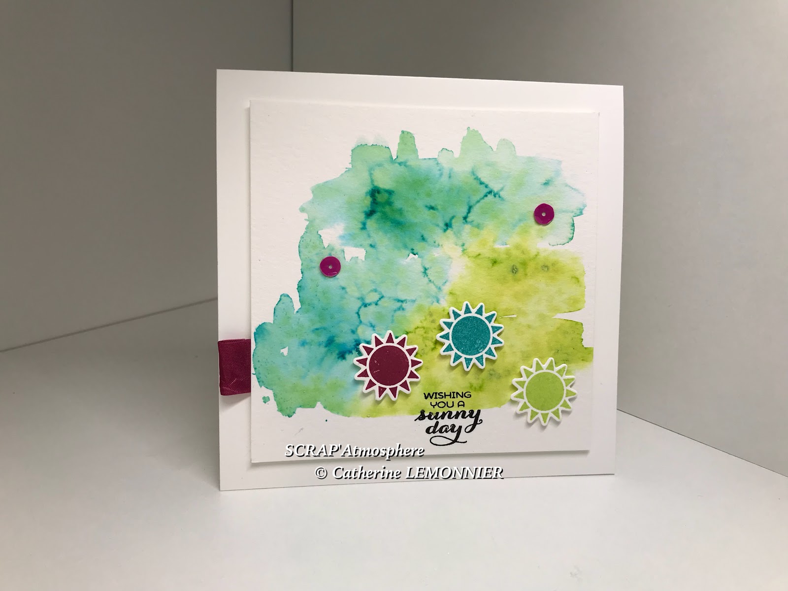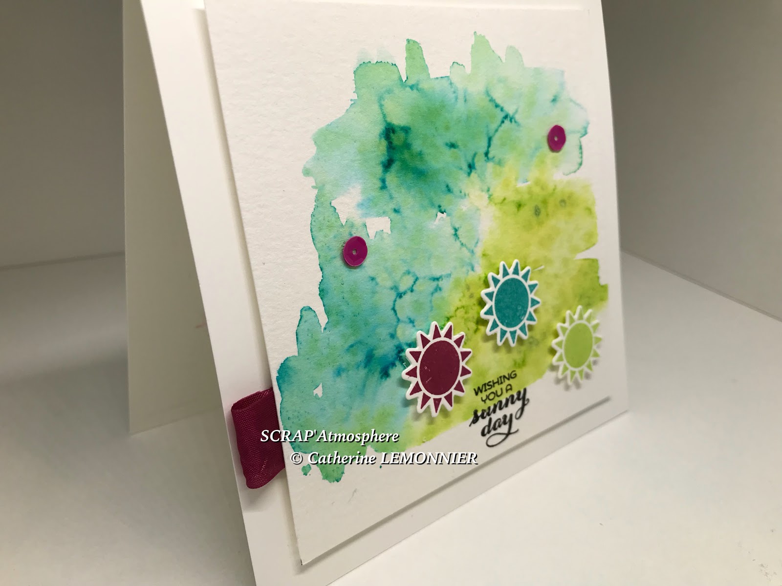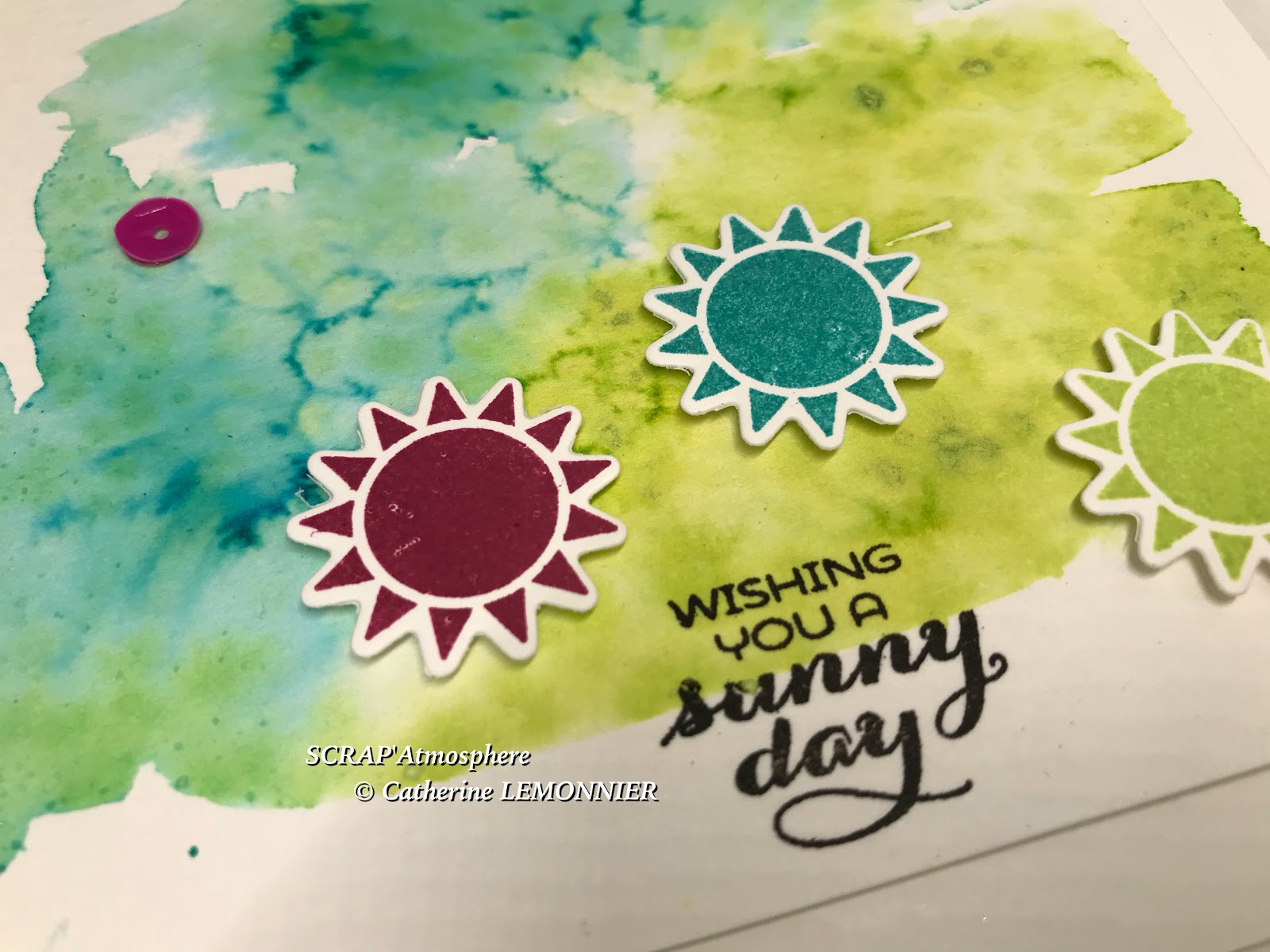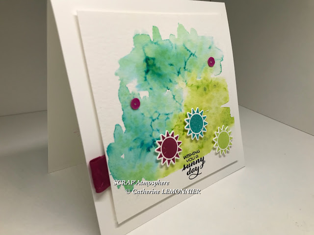 Pour les soleils déclinés dans les 3 couleurs du combo, ainsi que pour le message, j’ai utilisé le lot de tampons et framelits Sunshine and Rainbows.