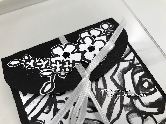 Le motif qui orne le rabat de l’enveloppe est un motif que j ‘ai découpé dans une des feuilles de papier, j’ai collé des strass noirs sur les cœurs des deux grosses fleurs mais ça ne se voit pas bien sur la photo…