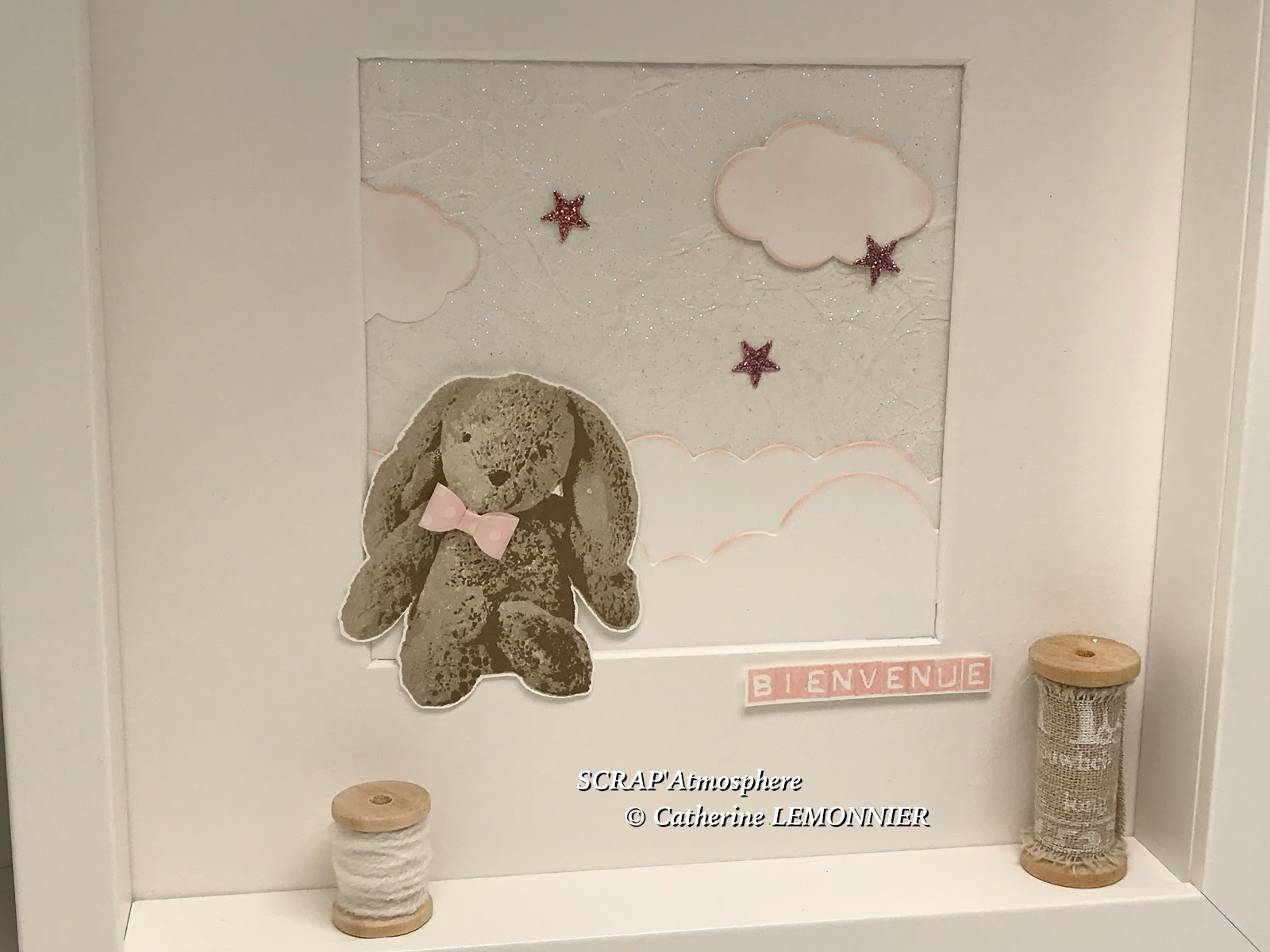 Parmi les propositions que j’ai faites, Melissa a retenu l’idée de ce petit cadre, j’ai donc conçu sur cette base un nouveau projet, mettant en vedette le joli lapin en peluche du petit catalogue printemps/été.