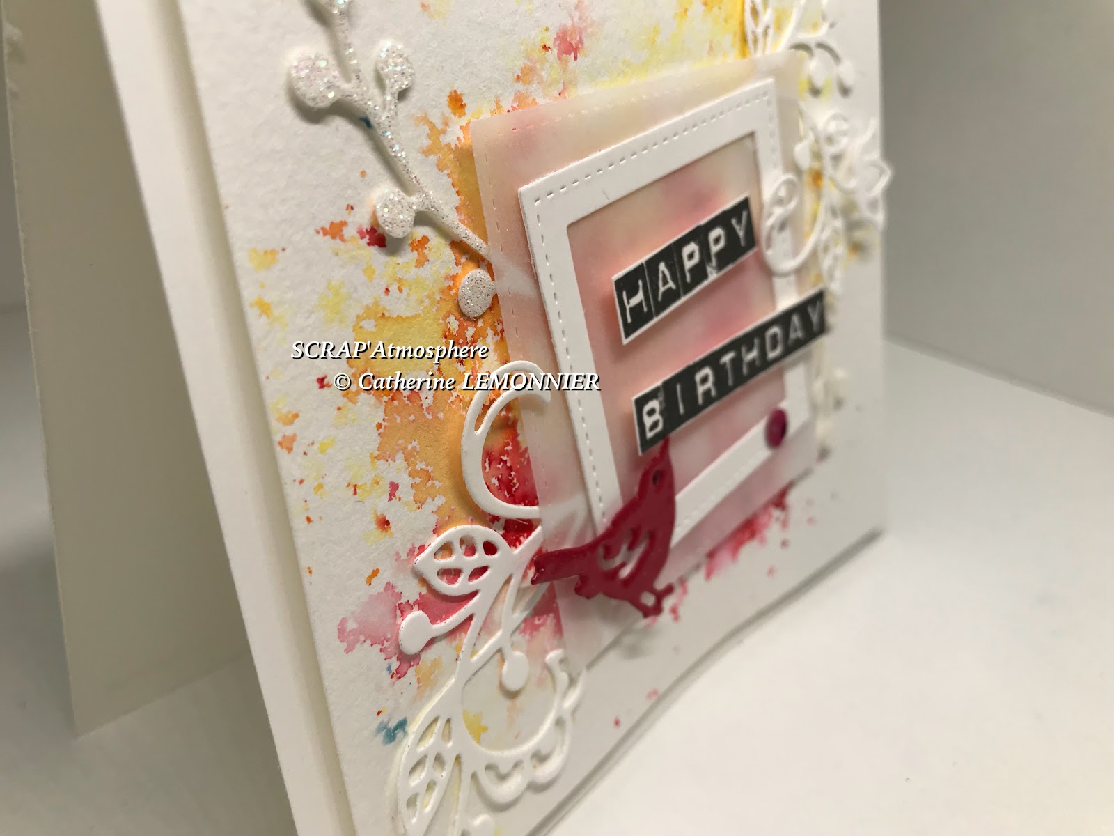 Pour les ingrédients : un fond travaillé aux brushos sur du papier aquarelle, puis quelques éléments décoratifs découpés à l’aide des sets de thinlits En fleur et Fleurs et oiseaux…et un petit cadre réalisé avec les Formes à coudre… Et enfin mon set de tampons fétiche pour faire le message, Labeler alphabet, et deux petits sequins pour terminer…