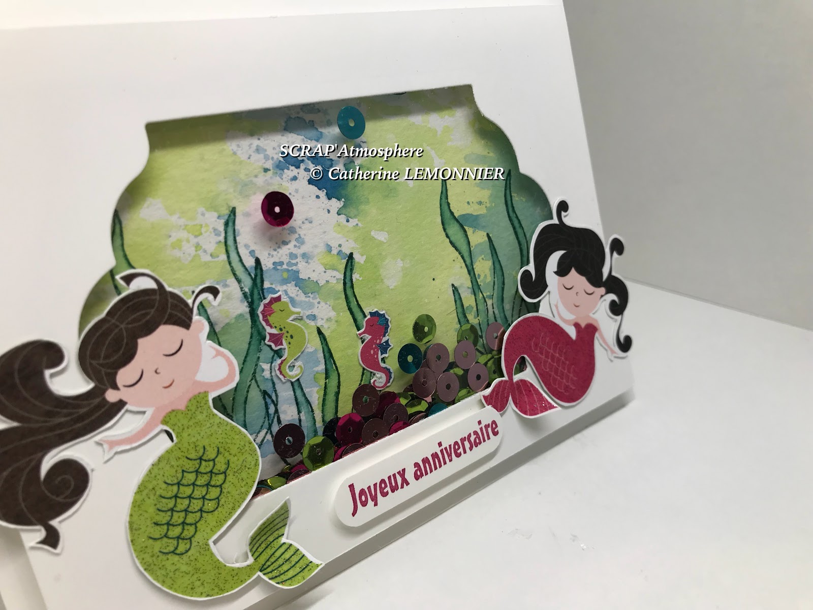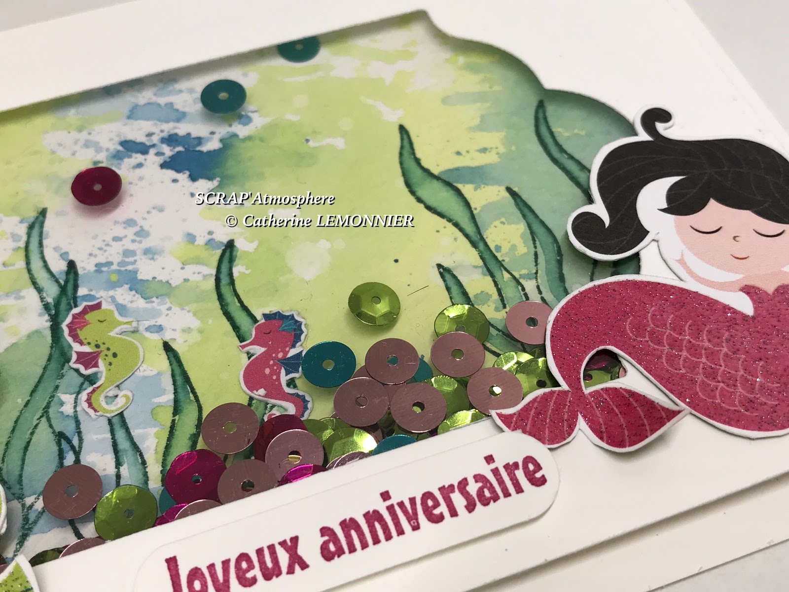 J’ai utilisé un fond aquarellé parmi ceux que j’avais en réserve, sur lequel j’ai tamponné des algues et j’ai étalé l’encre des contours avec mon aqua-painter… J’ai détouré des hippocampes dans le superbe papier Au pays de l’imaginaire et je les ai collés sur mon fond marin, puis j’ai ajouté des sequins de différentes couleurs assorties à la carte…
