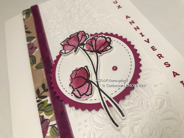J’ai utilisé un des tampons du set Aime ce que tu fais, et le très beau ruban en velours Fruit des bois associé au papier de série design de la même collection, que je vous ai déjà présenté.