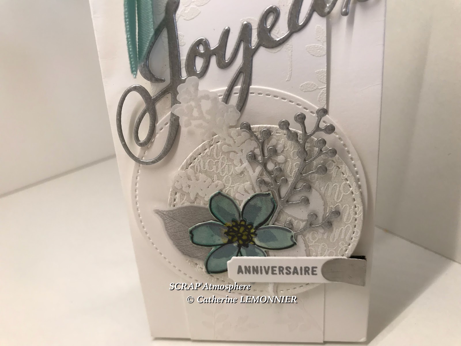 La réalisation de cette pochette (taille M) nous a permis d’utiliser un certain nombre de nouveaux produits, en-dehors du lot de tampons et framelits Blanc de Givre : les poinçons thinlits Joyeux Noël, la peinture chatoyante Brume de Champagne, les trombones galvanisés, le papier métallique galvanisé, le ruban en velours Marée montante…