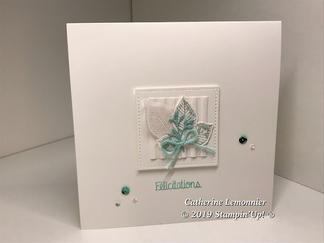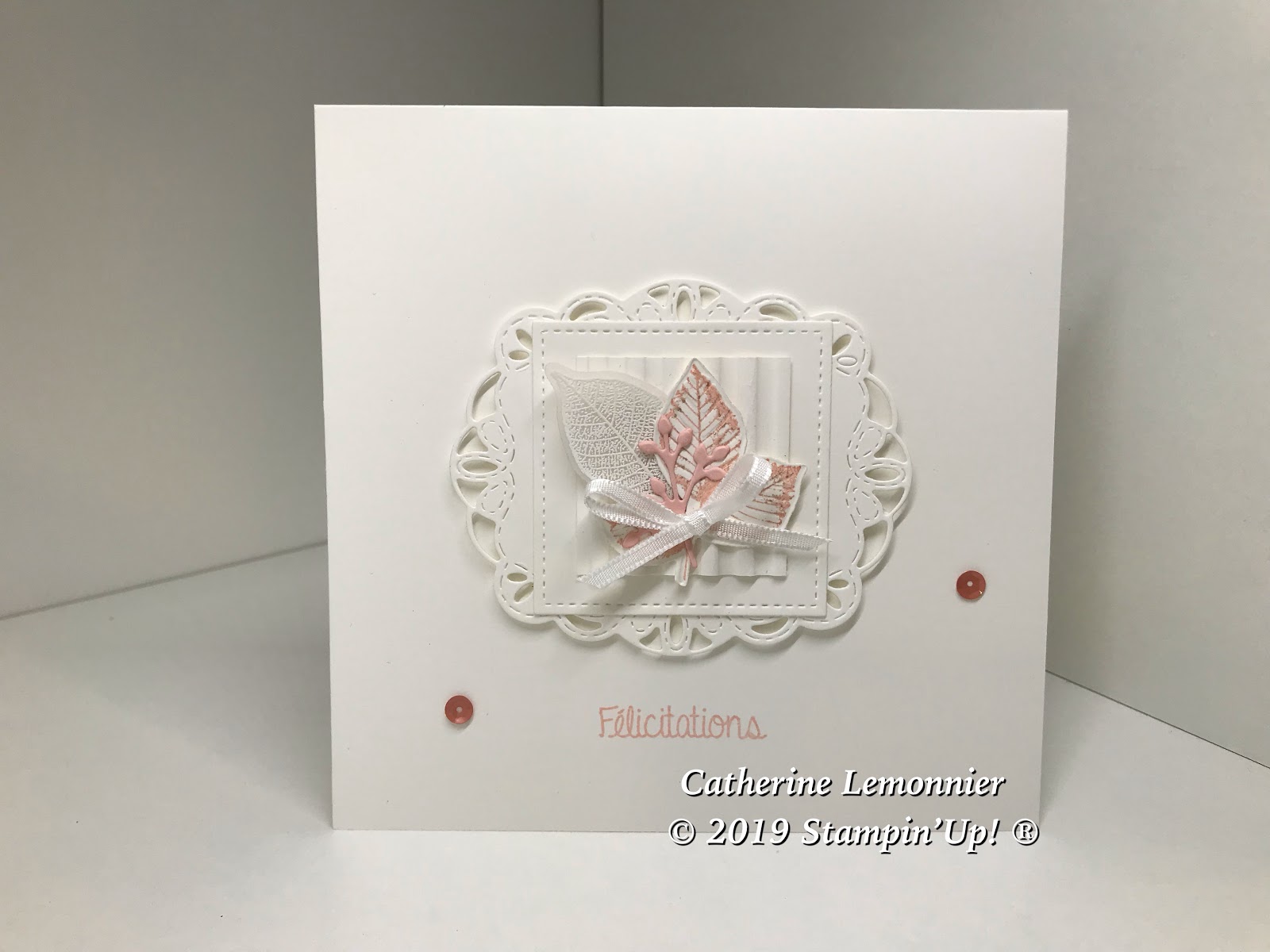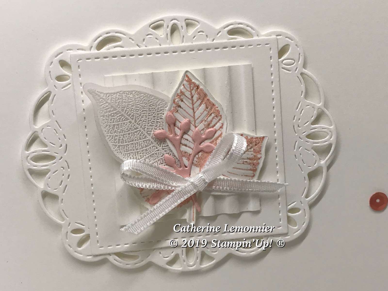Alors en premier il s’agit d’un framelit du set Etiquettes à Coudre (page 220 du catalogue annuel), puis un carré des Formes à Coudre (page 220), deux feuilles du set Les Racines de la Nature (page 218), et le petit feuillage rose vient du set de framelits Fleurs Merveilleuses (page 11 du petit catalogue été). J’ai utilisé également le plioir à gaufrage profond Impression Ondulé du petit catalogue de Noël.