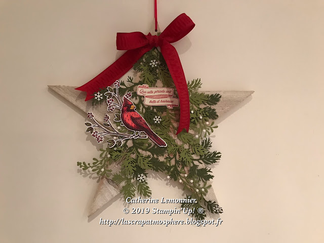 Je me suis amusée à perforer les « boules de gui » et les flocons dans le papier à paillettes Etincelants, et pour finir j’ai fait le noeud avec le beau ruban ruché Rouge-Rouge…