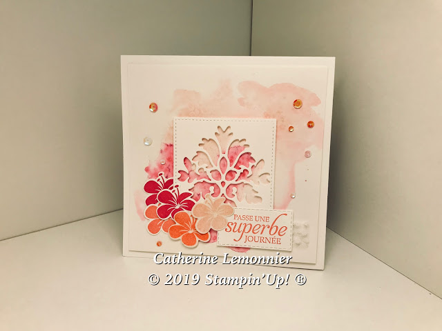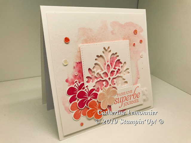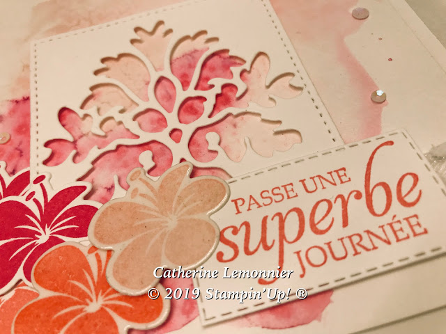 Vous y retrouverez l’un de mes ingrédients favoris : un fond réalisé avec les encres liquides sur papier aquarelle…Puis une belle découpe (poinçons Arrière-plans distingués) collée en 3d, des fleurs (poinçons Tropicaux) en harmonie avec les couleurs du fond, le message tamponné sur un Surpiqué rectangle, un petit morceau de ruban en tulle A pois et des sequins…