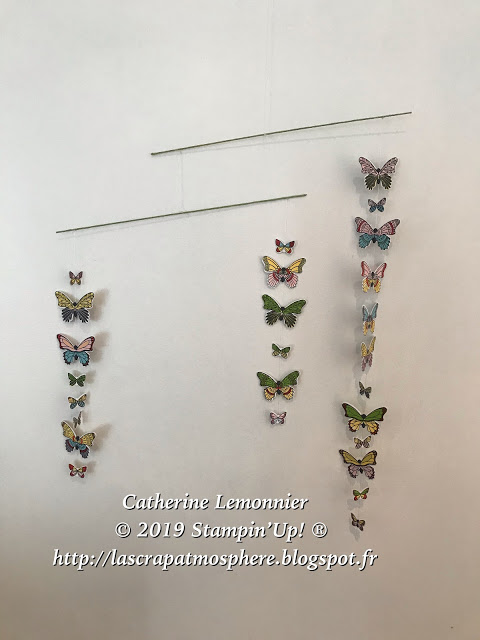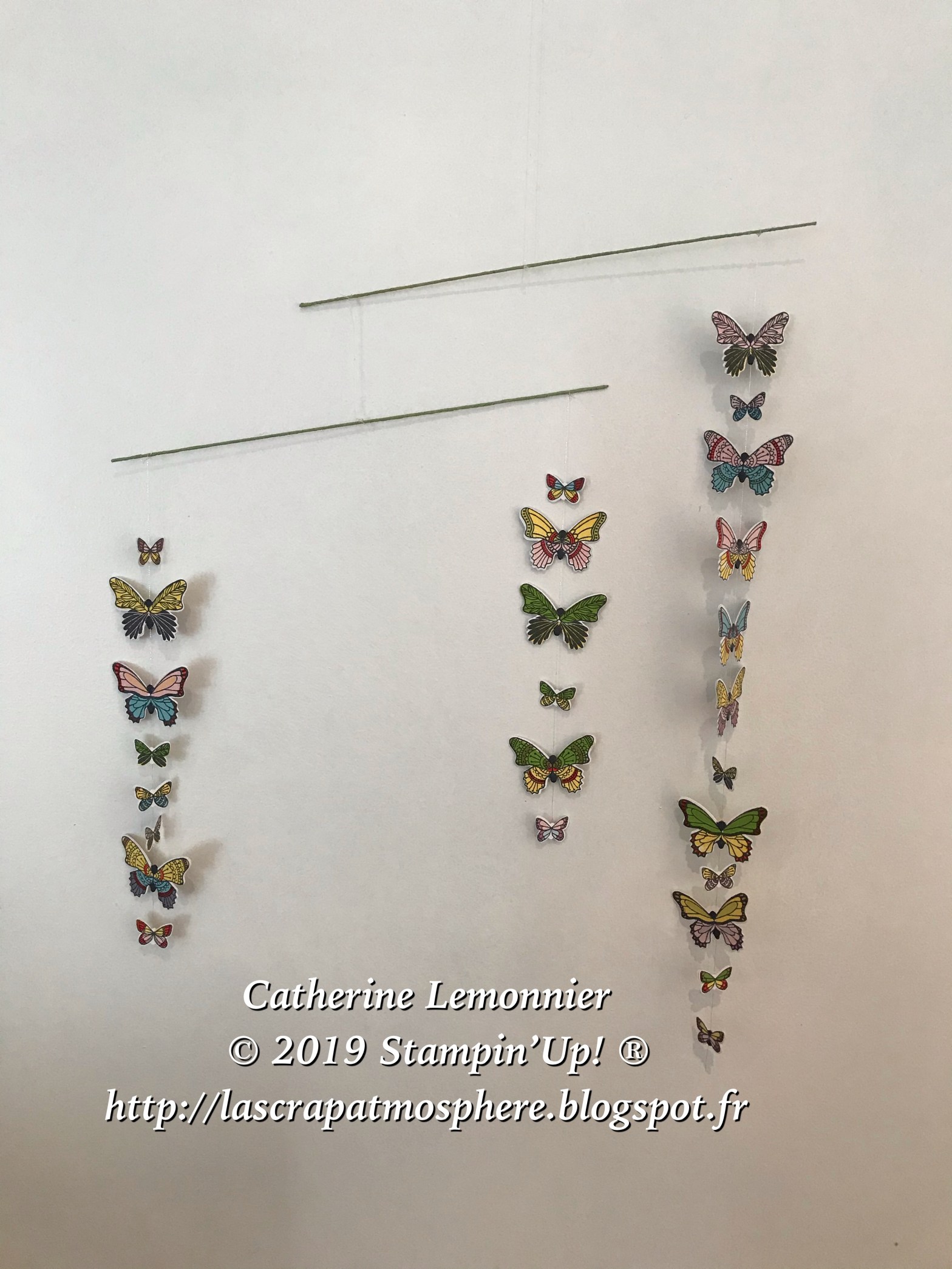 Pour réaliser ce mobile, il vous faut : du cardstock Murmure Blanc, le set de tampons Gala de Papillons, la perforatrice Papillons en duo, et des feutres. Pour la structure, des baguettes (ici des baguettes de marque Rayher de 50cm de longueur et 1mm de diamètre que j’ai coupées en deux) et du fil de nylon…