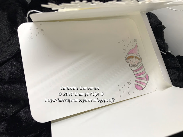 Pour le matériel de cette pochette, j’ai utilisé bien sûr les jolis tampons Mon petit lutin…Mais aussi les poinçons Cadres givrés et Scène de boule de neige…