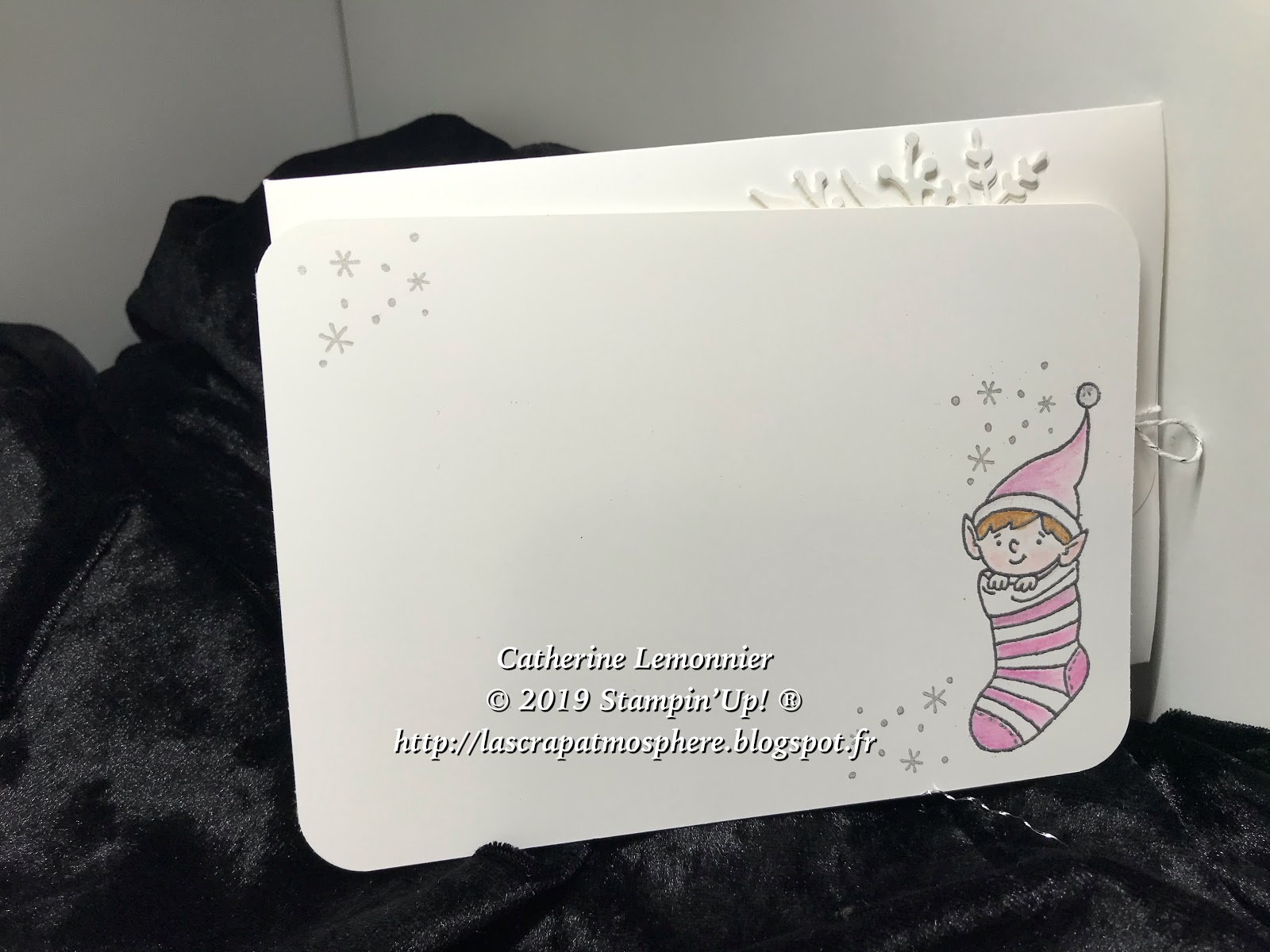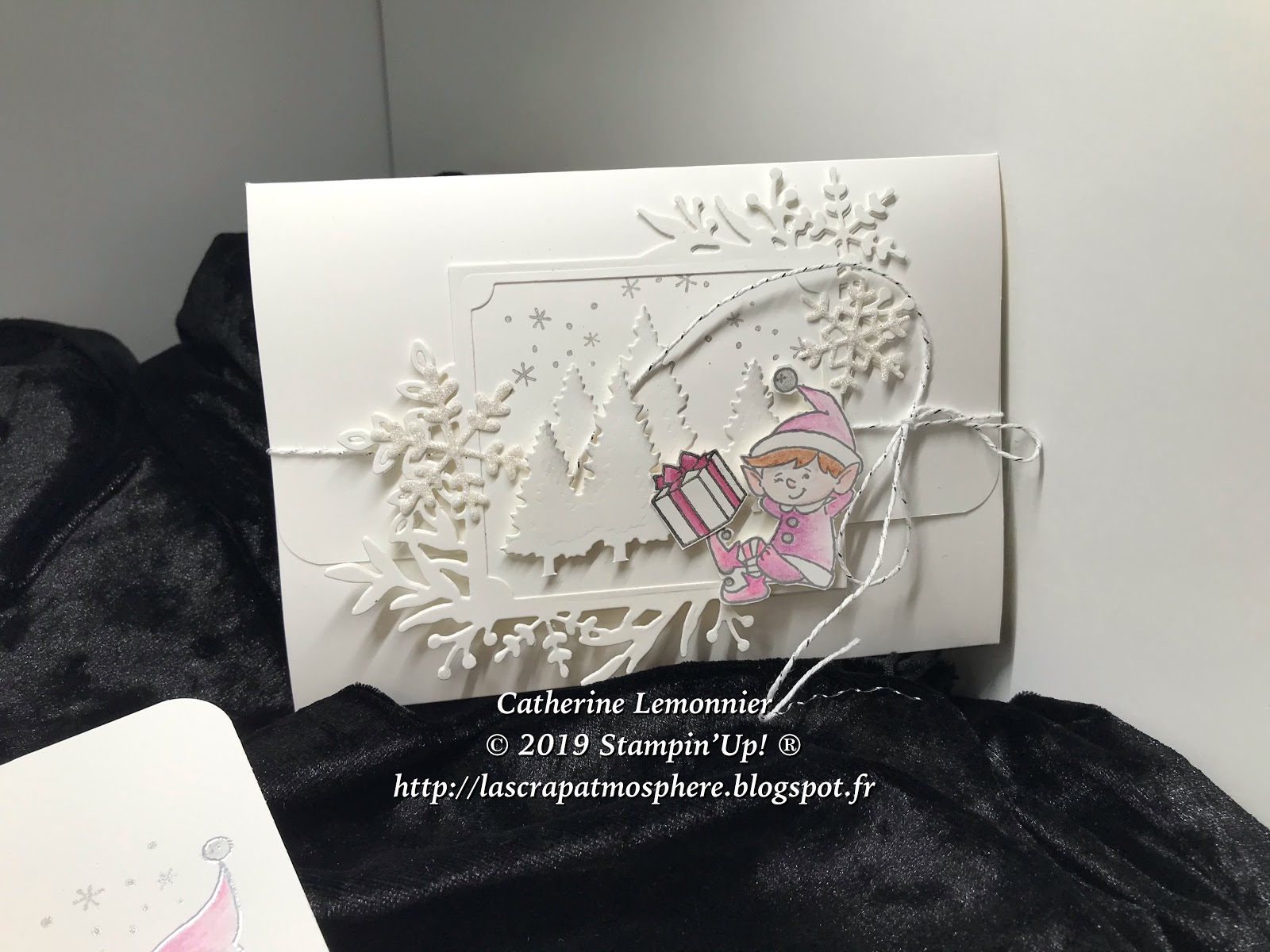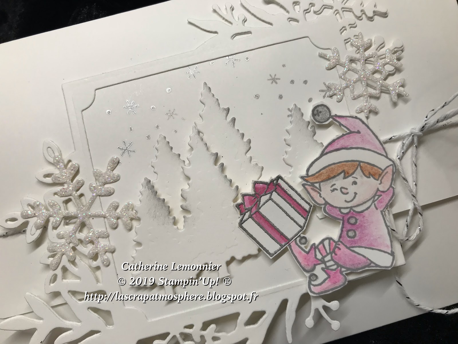Pour le matériel de cette pochette, j’ai utilisé bien sûr les jolis tampons Mon petit lutin…Mais aussi les poinçons Cadres givrés et Scène de boule de neige…
