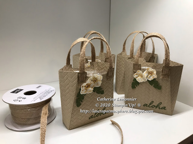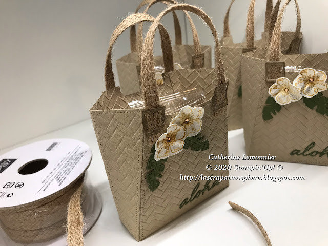 J’ai créé ce joli sac avec un  poinçon du lot Juste la classe. J’ai embossé avec le plioir à gaufrage 3D Tissage sur la plage, et pour les anses j’ai utilisé du Galon en jute tressé.