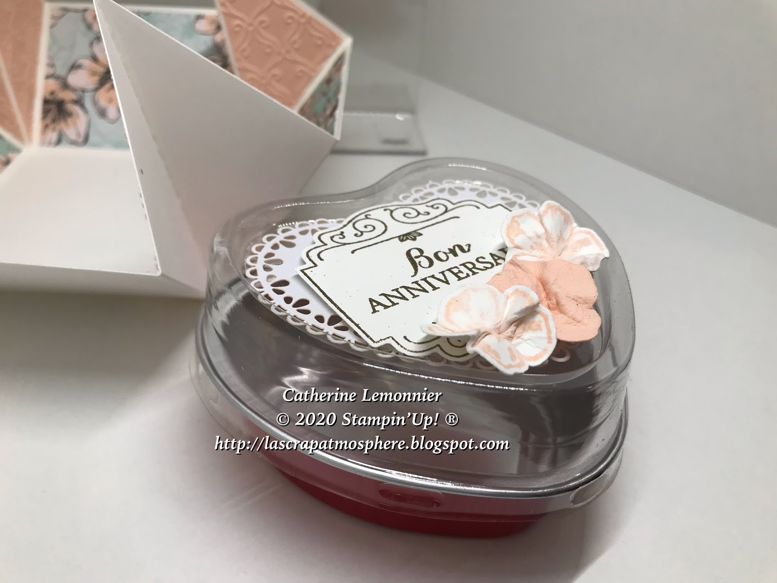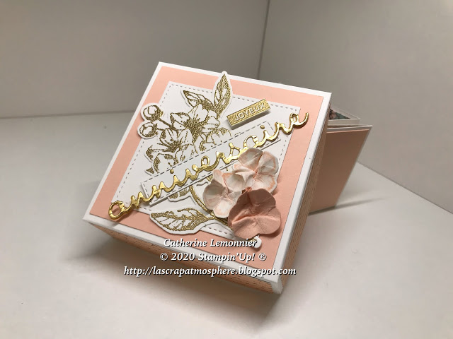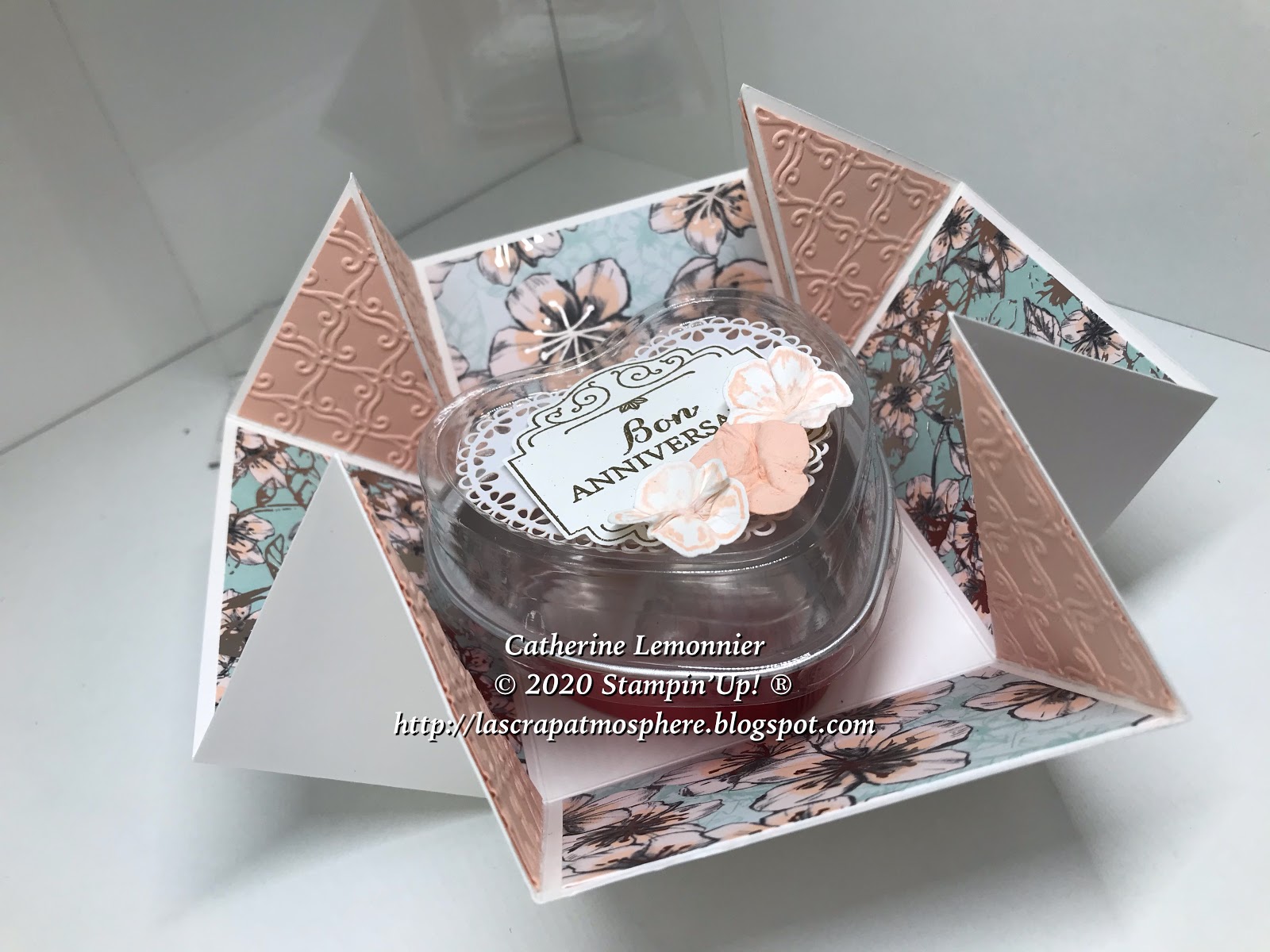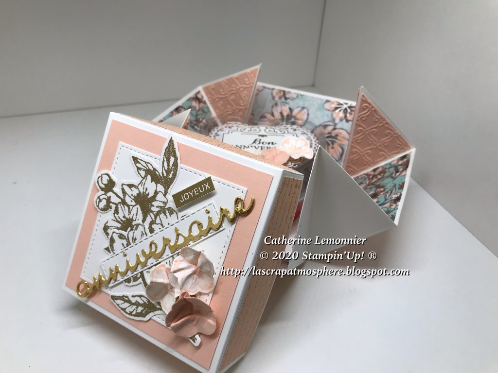 Le premier atelier de cette année, c’était boîte à explosion…Vous avez déjà pu voir celle que j’ai créée dans le cadre du blog hop des Créatives, et que j’ai proposée en atelier, mais j’ai également créé une deuxième déclinaison de cette boîte, sur le thème anniversaire, et mes clientes ont ainsi pu choisir le projet qui leur convenait le mieux !